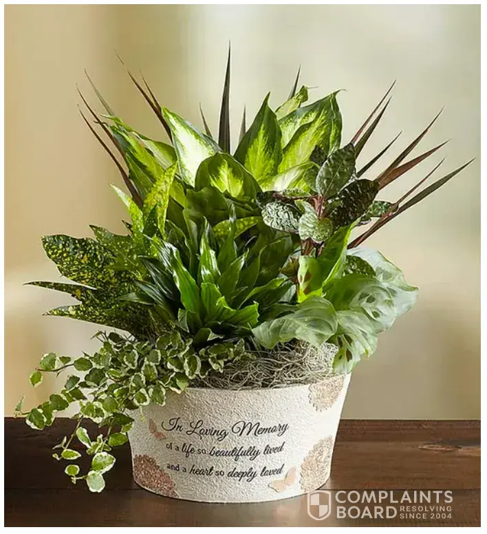 My name is Margaret Murphy Webb and I ordered a sympathy planter with small plants for Donita Greene from your website on April 23rd. The order number is above. She received the plants and sent a picture to me yesterday. I couldn't believe the difference in the plants she received and the planter that I saw on your website. The planter she received looks as though there are missing plants. It is not as full as the picture I saw on your website and I am not pleased. The one Ms. Greene received looks as though two small plants were thrown into the pot and it was sent out. Unacceptable.
