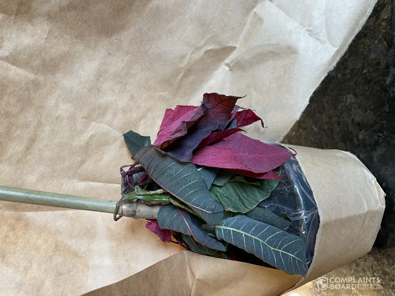 I ordered 3 pointsettias for delivery on Dec 17 for centerpieces for party on Dec 18. Several days later I ordered 1 more. On 12/17 I received 1. On Dec 18 I went out and bought centerpieces. Then I got 2 more of the pointsettias I had ordered delivered later on the 18th. I dud not received the 4 th until today December 21. Attached is a photo of that horror. 1800 flowers would not let me cancel this order once it became apparent that I was not going to get this in time. At an absolute minimum I want me money back for the dead one