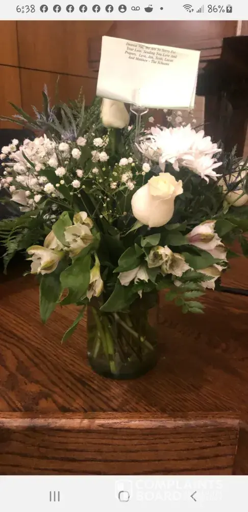 The flowers were delivered a hour and a half late. They came in AFTER the service had already began. The wreath that was ordered proceeded to leak all over the floor leaving a water stain in the church's carpet.