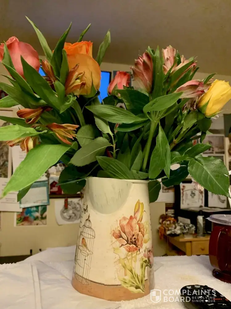 I ordered roses for a sympathy order # wo1005762744012. Ordered on 6/2/2021. Was very dissatisfied with how they looked and I paid over 90 dollars with delivery and tax. I always order from you and other flowers and baskets were beautiful. The pic taken looks like a 10 dollar plant