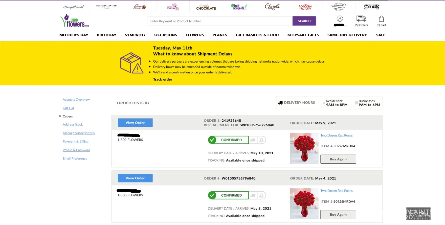 Two weeks ago, I ordered flowers for my mom for Mother's Day (April 29, 2021) my bank account was charged $157.64 from 1-800-Flowers. I specified that I wanted the flowers delivered to her home in Yakima WA. on May 7, 2021.
