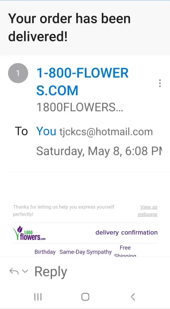 I placed an order with 1800 flowers five days before Mothers Day. I received an email from them on the day before Mothers Day stating that my order was delivered. It was never delivered. At 10pm on Mothers Day I received an email stating that they never found a local florist to fill the order. So, my 88 year old mother in assisted living received no flowers on Mothers Day. 1 800 flowers is an evil and dishonest company