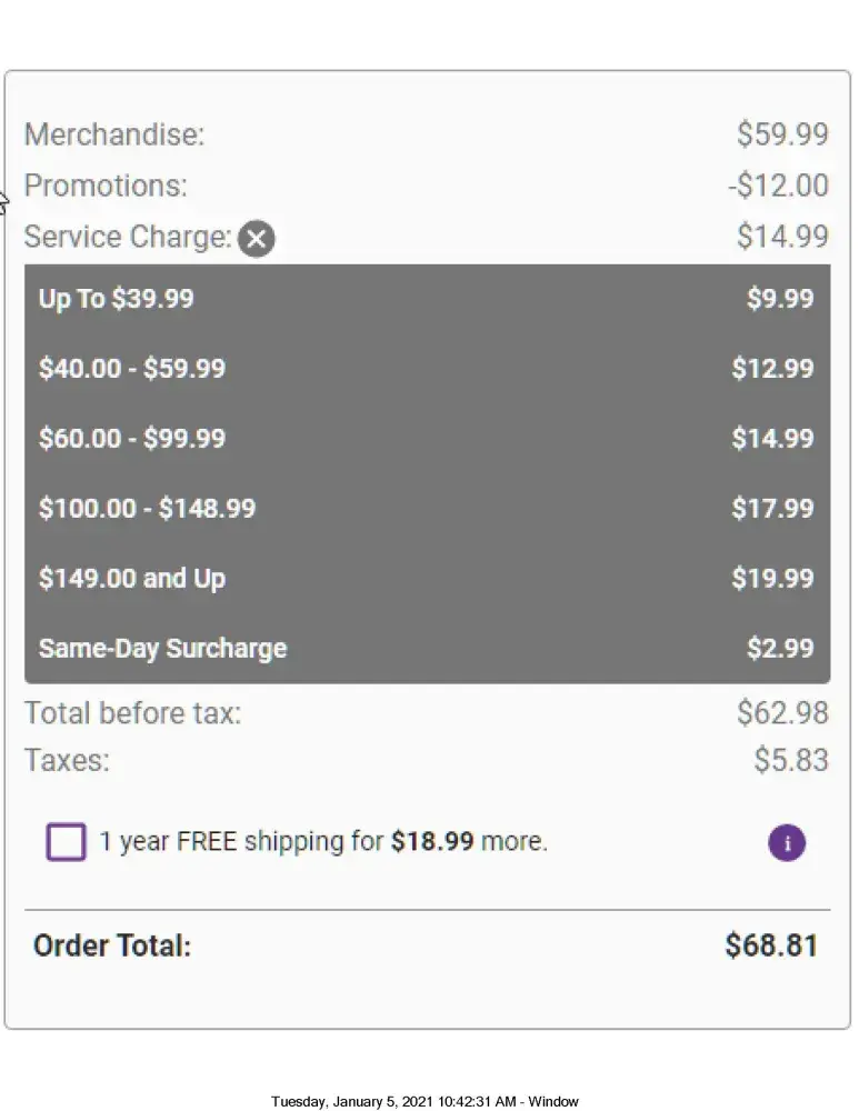 I ordered flowers from their FB ad that said Free service charge if I ordered sooner rather than later for Xmas delivery. I clicked on and choose a Holiday centerpiece. I filled out the order and wrote in all pertinent info. The process was continuing along to the point where I would put in c card info and then review order before it went through. Well, it went through without my reviewing it. I went to my email and there was the order with the $14.99 service charge. I called them and they told me they would refund the $14.99. I am not sure if they will. I will dispute the charge if necessary with Visa. I took a pic of FB ad... good thing cause I couldn't find it after the fact.
