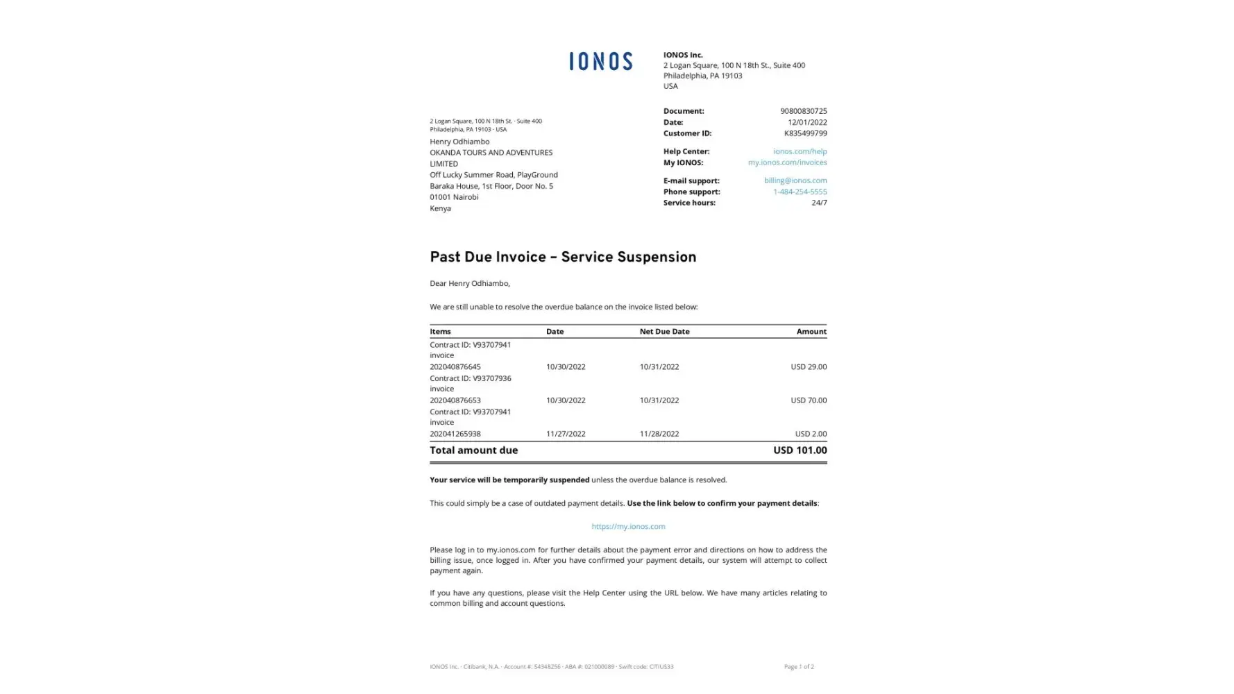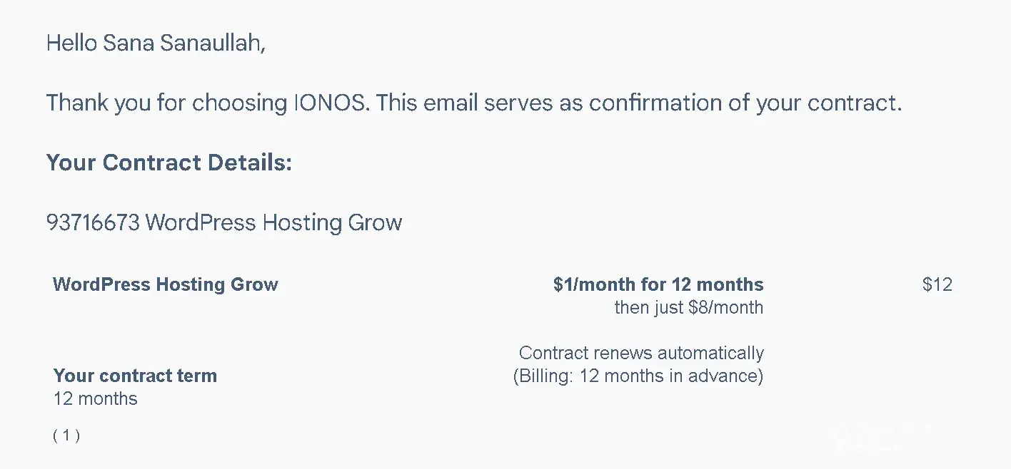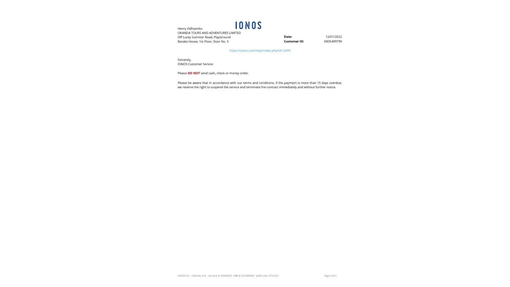 About a week later, 1AND1 INC sent a reminder that there was a dispute in collecting payments from my bank and that I needed to clear an outstanding balance of $99 without which their service would be suspended.