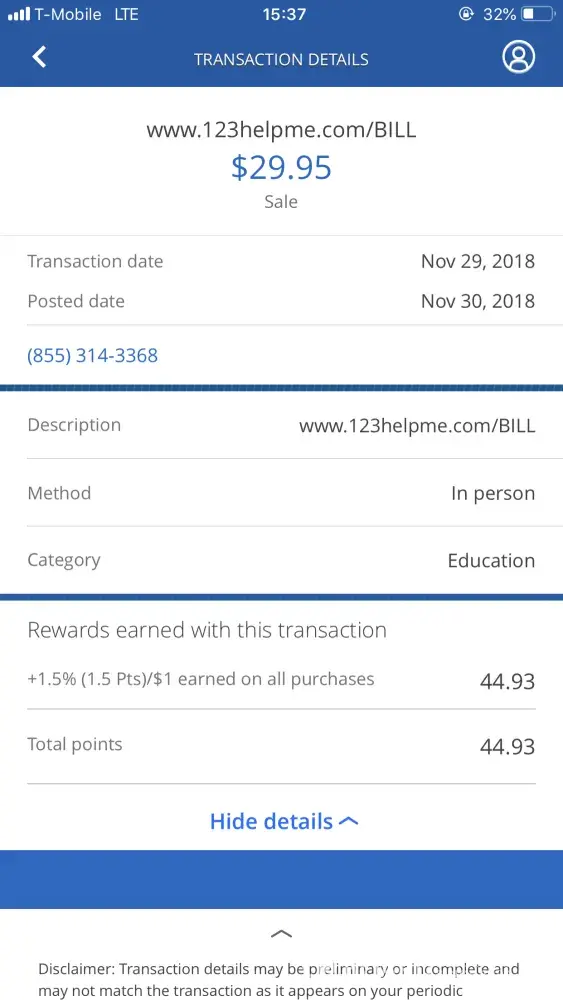 11/01/2018 POS Debit - Visa Check Card 1907 - 123HELPME.COM BILL [protected] CA POS -$29.95