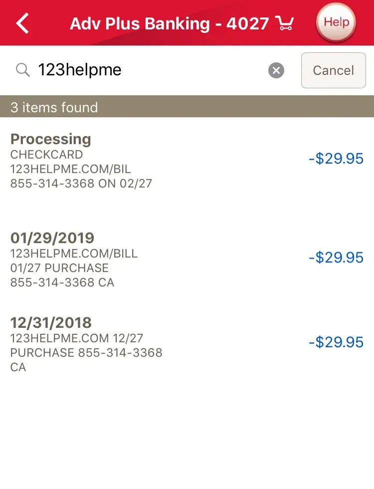 12/03/2018 POS Debit - Visa Check Card 7035- 123HELPME.COM BILL [protected] CA POS -$29.95
