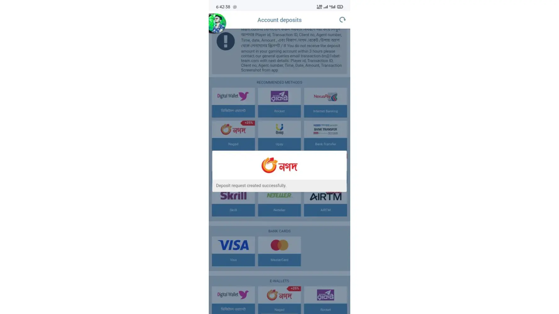 Sir i have diposit problem.18 hours gone but they are Don't solve my problem .i was try to diposit by fast Nagad 500/ taka (Bangladeshi currency). Diposit was successful but i didn’t get money yet In my 1x bet account. I was send email as per 1x bet law. But they are want video proof . that's why I also was send it by email. But they are Don't solve my problem yet. After 3 hours they are send email and they are Write don’t came any information from technical department. AGAIN we are froward your information in our technical Department . You want know update contact our gmail address.
