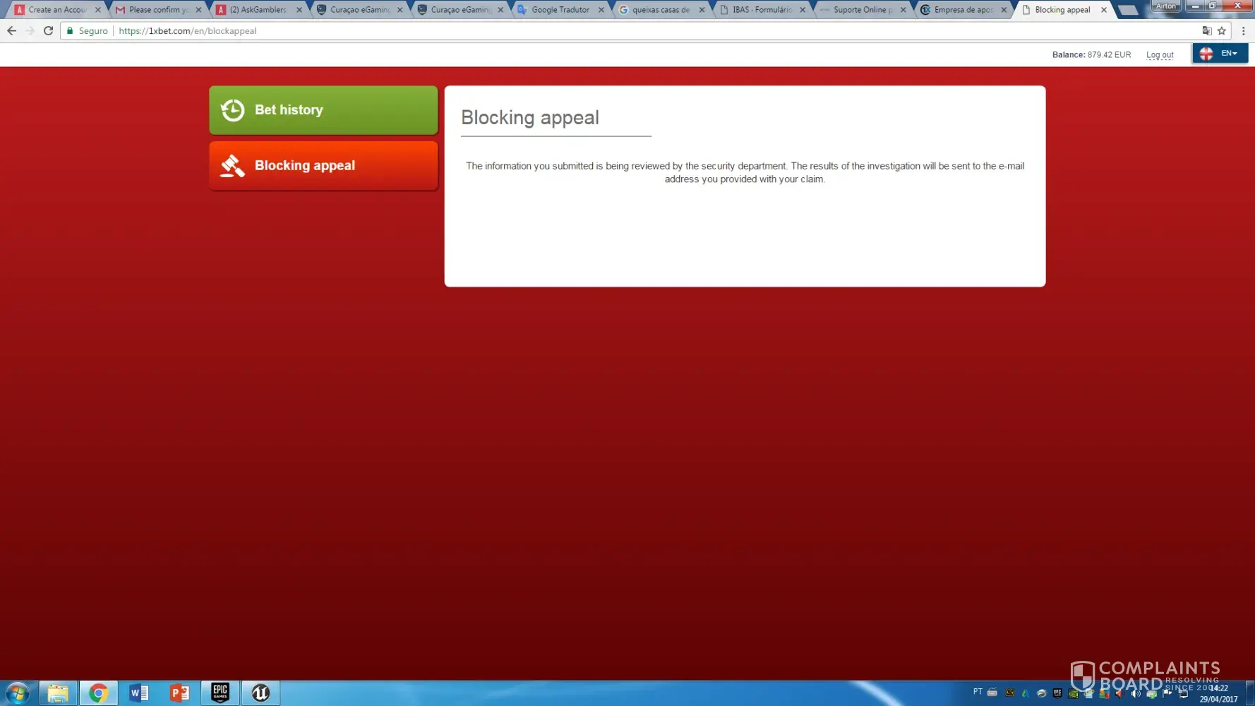 My account with 879.42 euros has been blocked since 04/25, I have returned an appeal form that asked me to wait 72 hours, after 72 hours, 1xbet sent me a new message asking me to wait another 72 hours.
