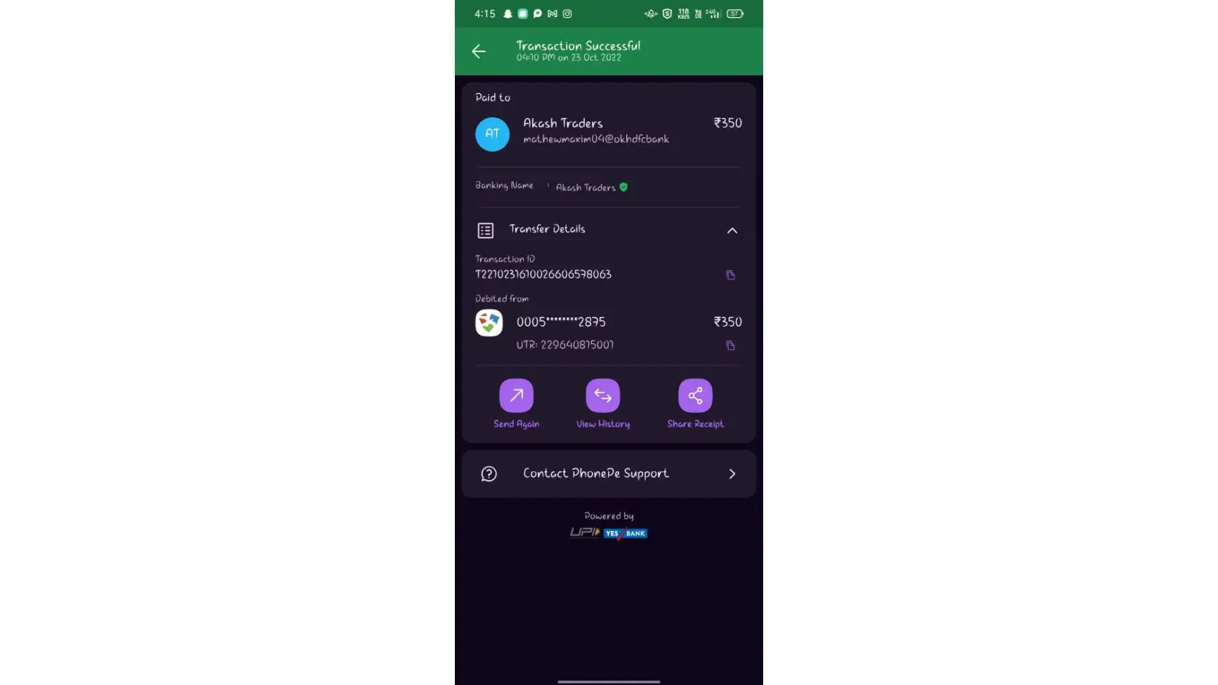 I deposited sum of 350 through phone pe but didn't get credited to my bet account.It says it will be credited within 5 hours but still didn't get credited.Please resolve this ASAP. I have attached image of transfer also ...