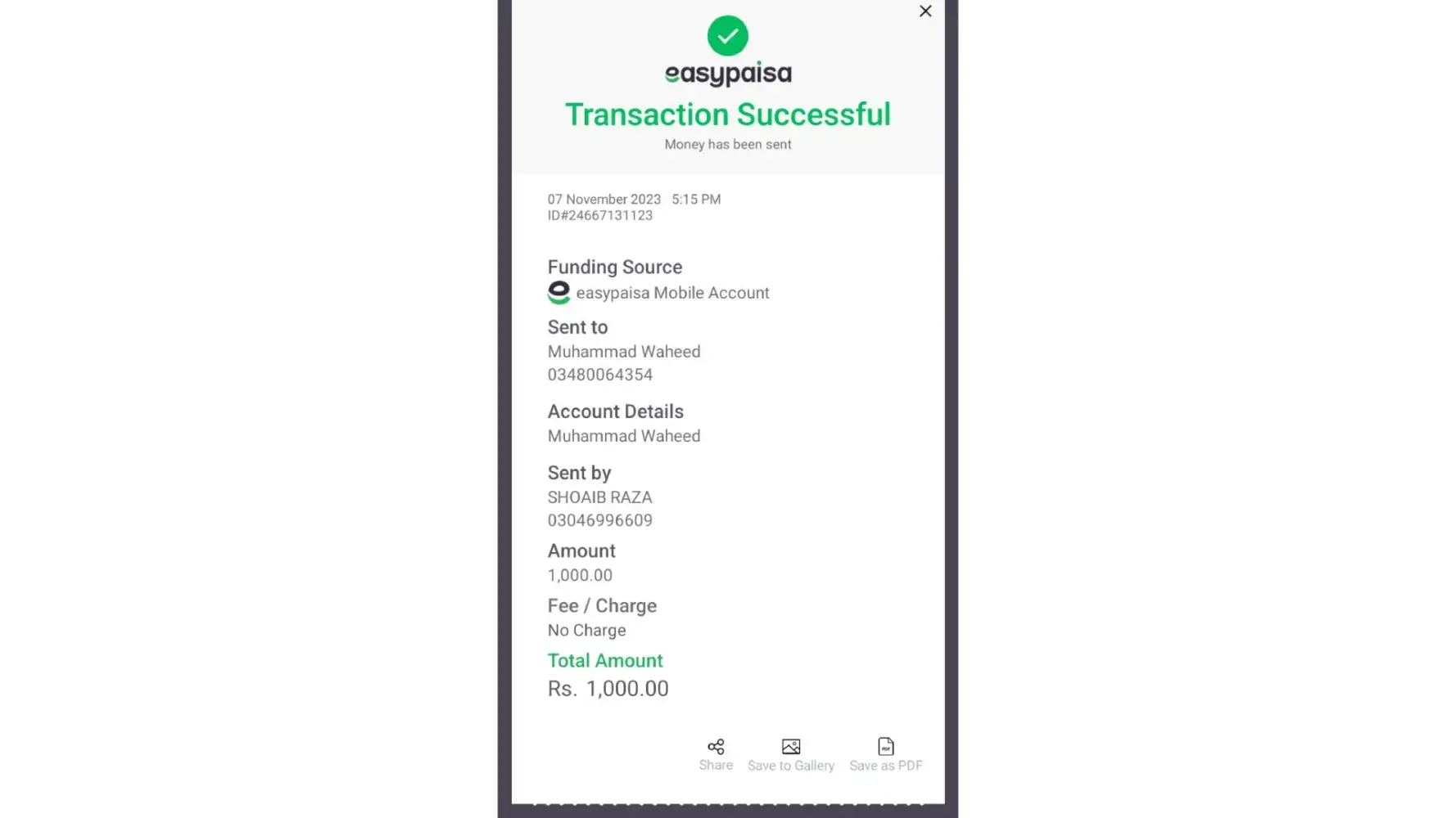 i send 1000 PKR from easypaissa account no:[protected] and Name shoaib raza in easypaissa account NO:[protected] And account holder name is Muhammad Waheed but did not credit in my account please resolve it as soon as possible