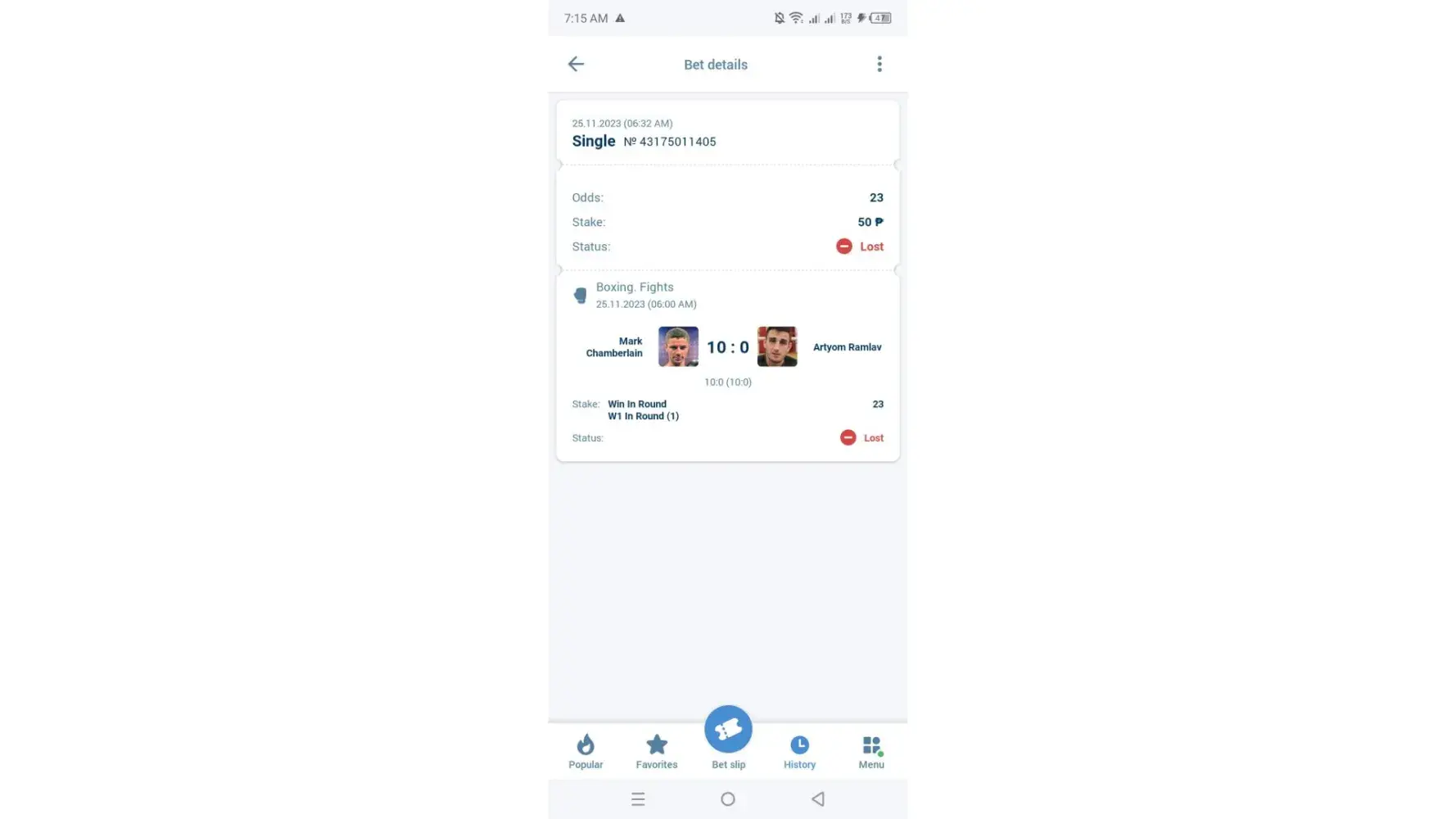 i was betting "win by round" on boxing and luckily my bet won the round 1 but how come i lost?