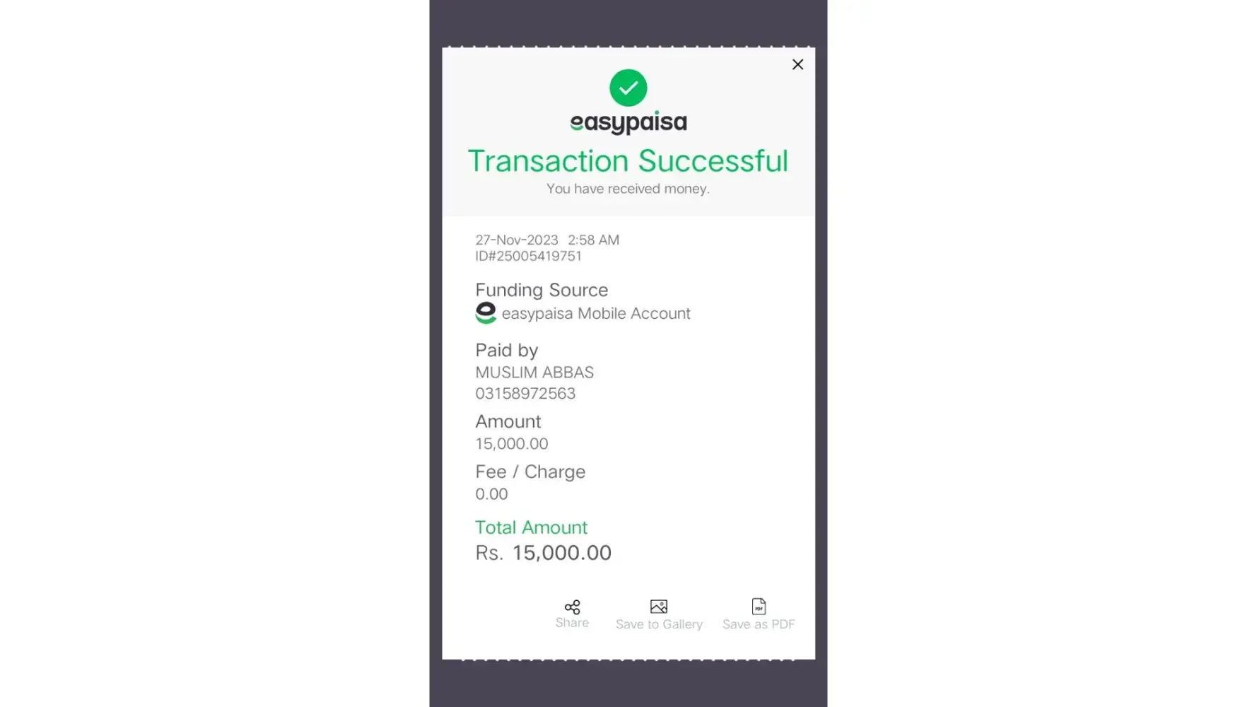 I didn’t recieve my. Payment of 800 Rs Pkr from Easypaisa Account name muhammad ahmed number [protected] in my 1xbet account username Ali Shazil i send that payment on 06 December 2023 09:34 Pm to him