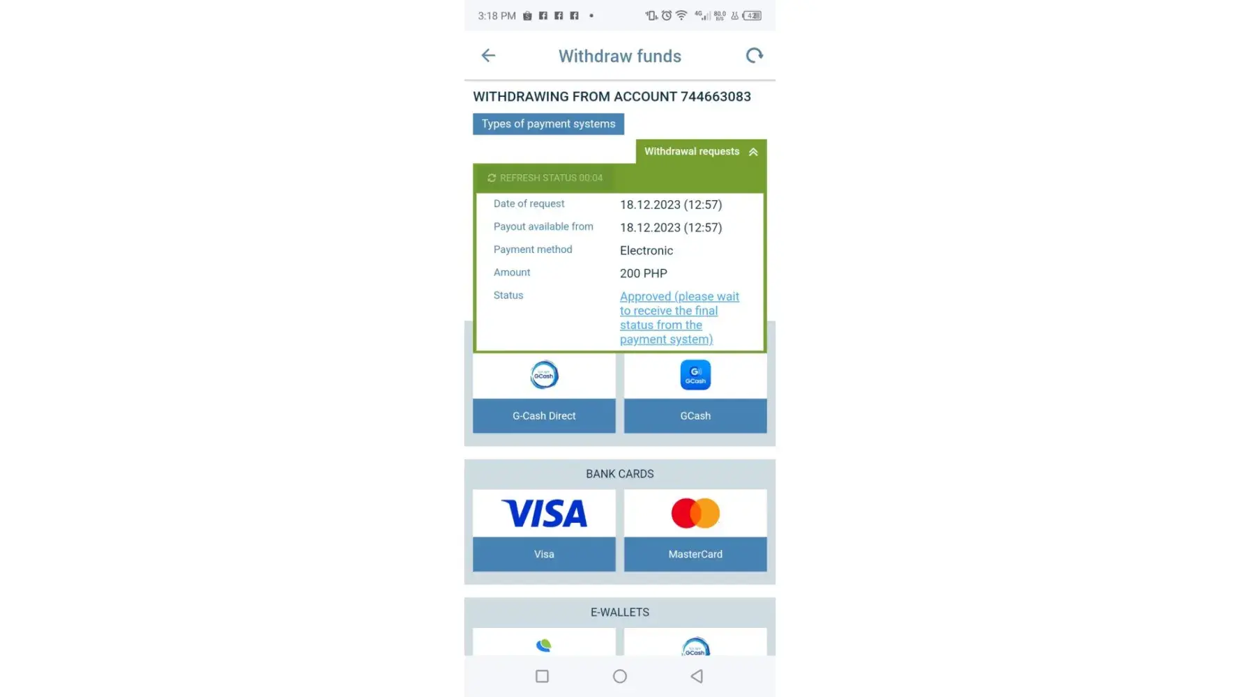 I requested a 200 pesos withdrawal on 12: 57 of December 18, 2023. It's 15:21 already and I haven't received my credits of 200 in gcash yet.