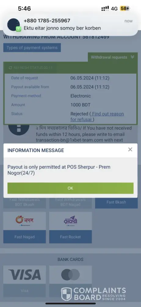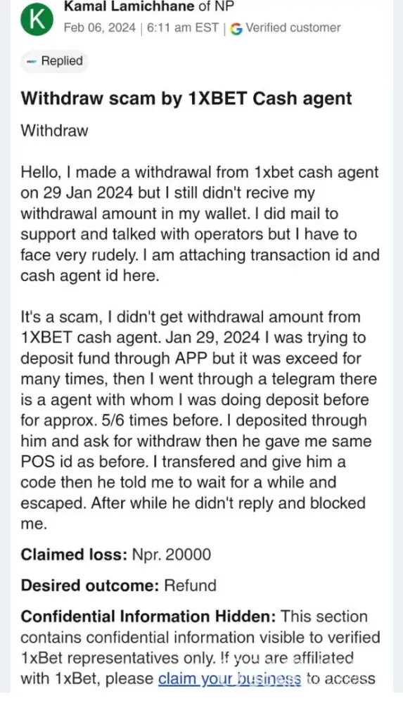 Thank you for reaching out to us. To assist you with this case, we would need some more information on this situation from you. Please don't send any personal data nor information regarding your transaction, as it could be used by scammers (if you can, please delete all the personal data from your review), and contact us at public.relations@1xpartner.com so that we could help you with your situation