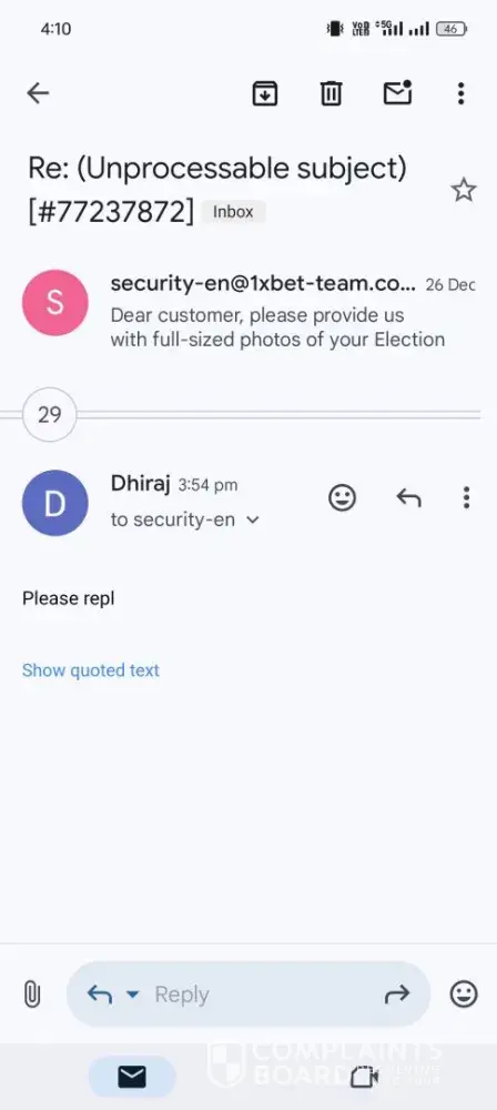 1xbet is not giving me withdraw Rs. 48,700 and security is not verifying my documents and is scamming me for Rs. 48,700 I am very worried, please give me my money, otherwise I will commit suicide .They asked me for the Aadhar card PDF and I sent it but still they are saying send the original document And now you security team not even replying