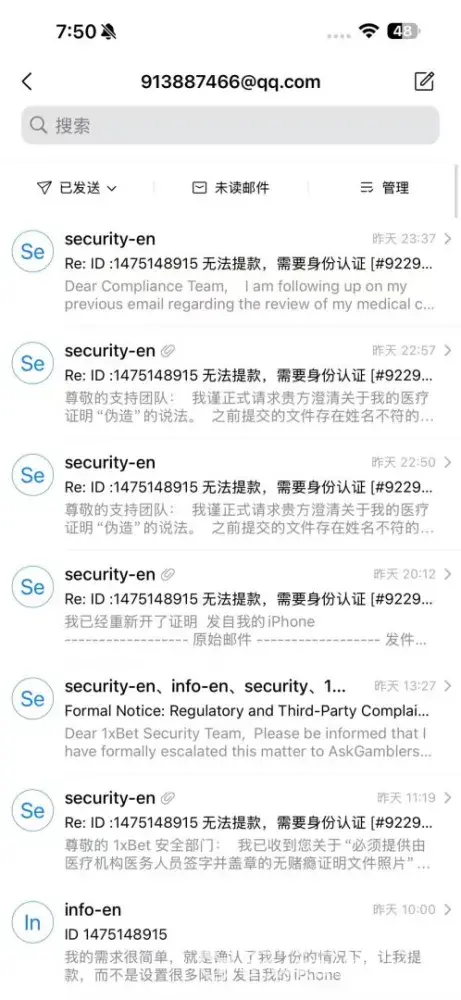 我的问题在12月20号就开始跟1xbet 沟通了,当我提交了身份以后,让我继续提交无赌博成瘾证明,我相继跑了三个医院,都以非原件,伪造拒绝,金额是49283.01墨西哥比索