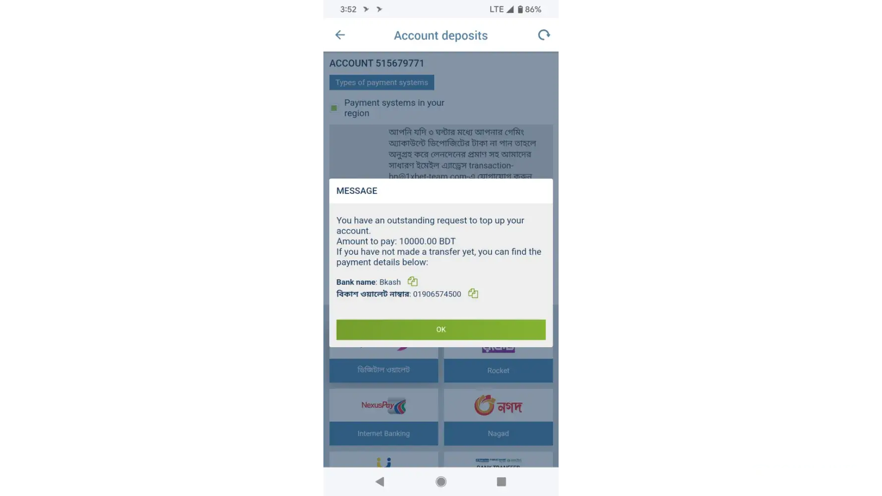I have deposited rs 7350 in my 1xbet account but money is not reflecting in my account.