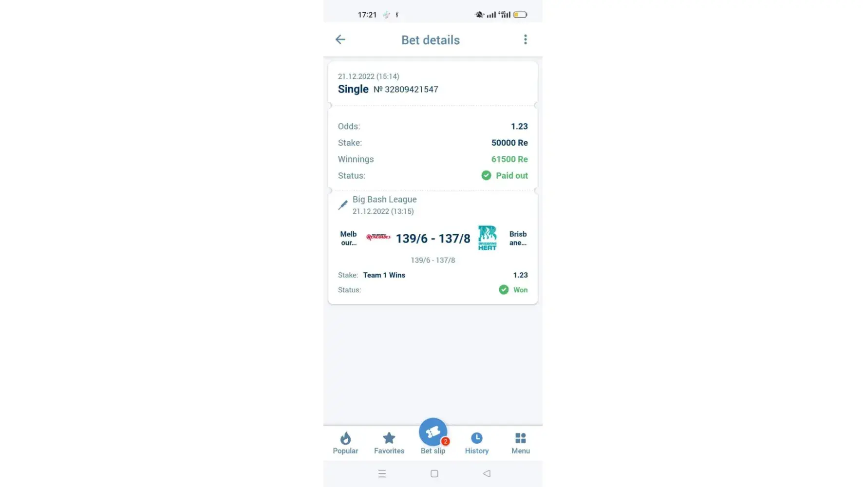 When I bet in bigbash(cricket) the odd is 3.65 after I win the odds has automatically changed in 1.23,I need my amount in my account, please solve this problem.