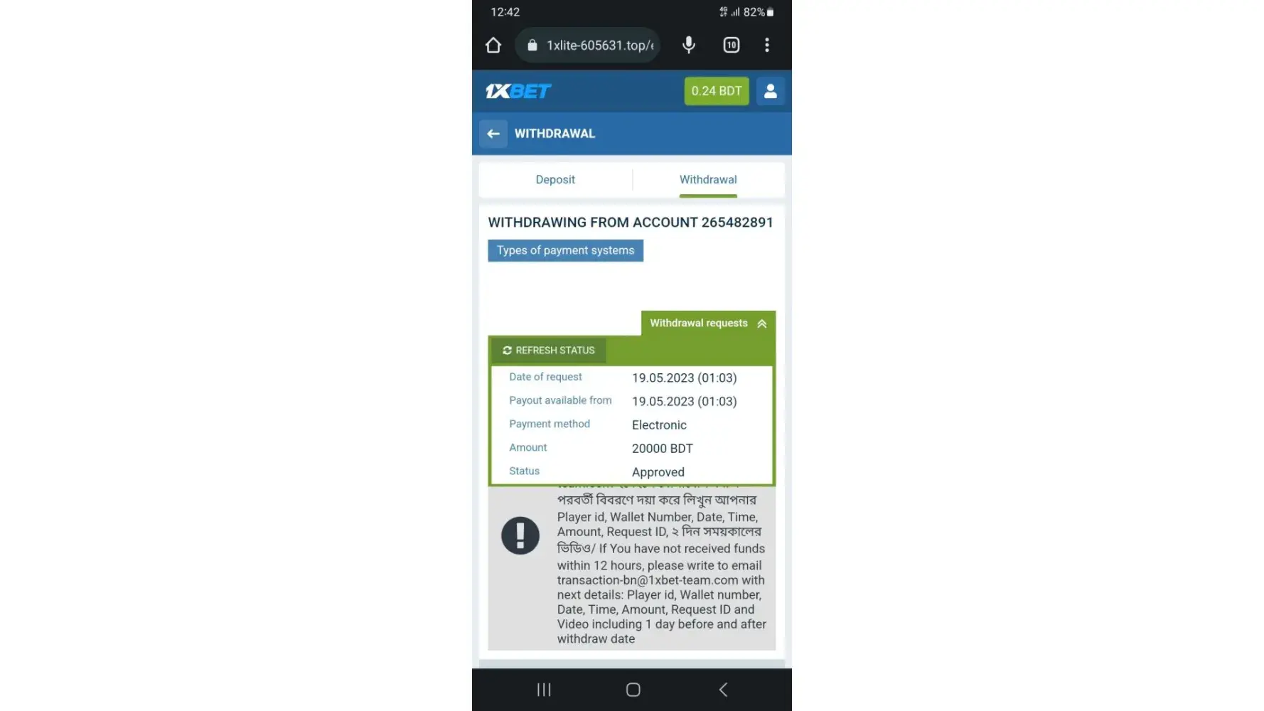 (Note: i mailed to" transaction-bn@1xbet-team.com " from mushfiqpk1234@gmail.com" including this information but dont get any response yet.