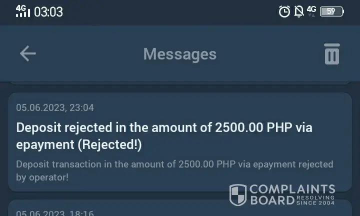 Deposit rejected amounting to 601.50 PHP and withdrawn amounting to 300 PHP not received on GCASH. Attached are screenshots of the transactions, hope to hear from youn soon and hopefully problem will be resolved as soon as possible thank you
