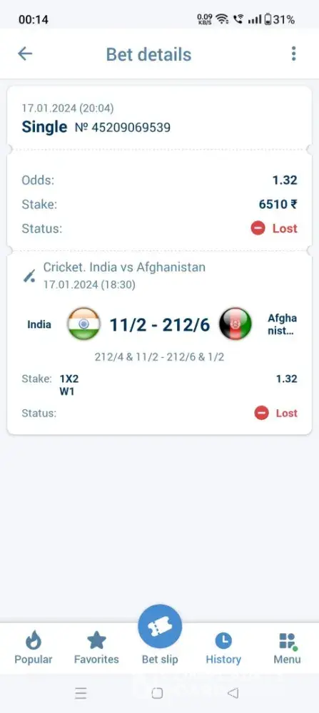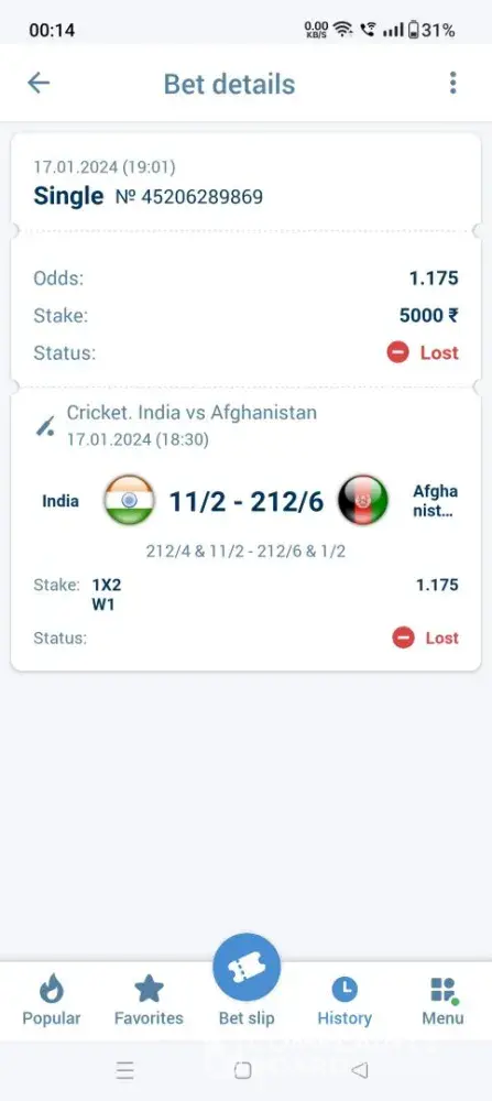 Sir I have placed a bet on team 1 and it's around 25 k,.By the end of the match india won by super over but it's showing that I am lost the bet. Kindly help.The amt 25k is big for middle class people.kindly respect that and refund the amount.I dnt want any extra money frm my win ,just return the capital tht is enough.or else I have to take legal action