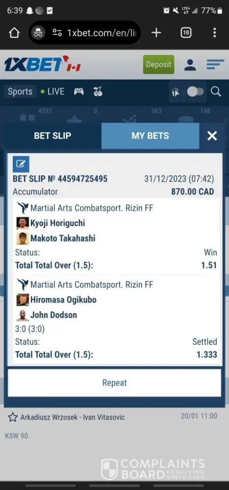 2 Sources for the outcome of fight which was incorrectly marked in my bet: https://www.tapology.com/fightcenter/bouts/823172-rizin-45-kyoji-horiguchi-vs-makoto-shinryu