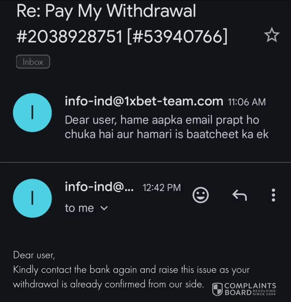 I again contacted them with official response from bank's mail screenshot, they again asked for bank statement on 18, I've sended them & today they again asked for statement till 19 , again I've sended them. This is happening since more than 12 days, I'm tired of asking my own money now. Many users facing this problem not only me. Please provide me my money as soon as possible whether in my bank account or refund in my 1xbet account [protected] so that I can initiate another withdrawal request .
