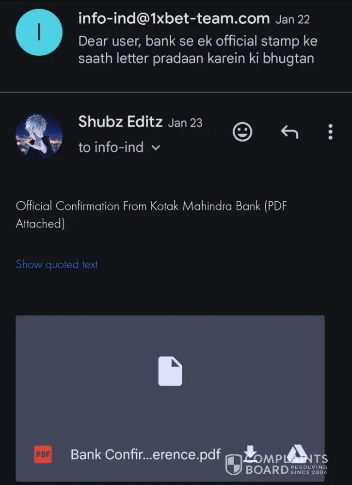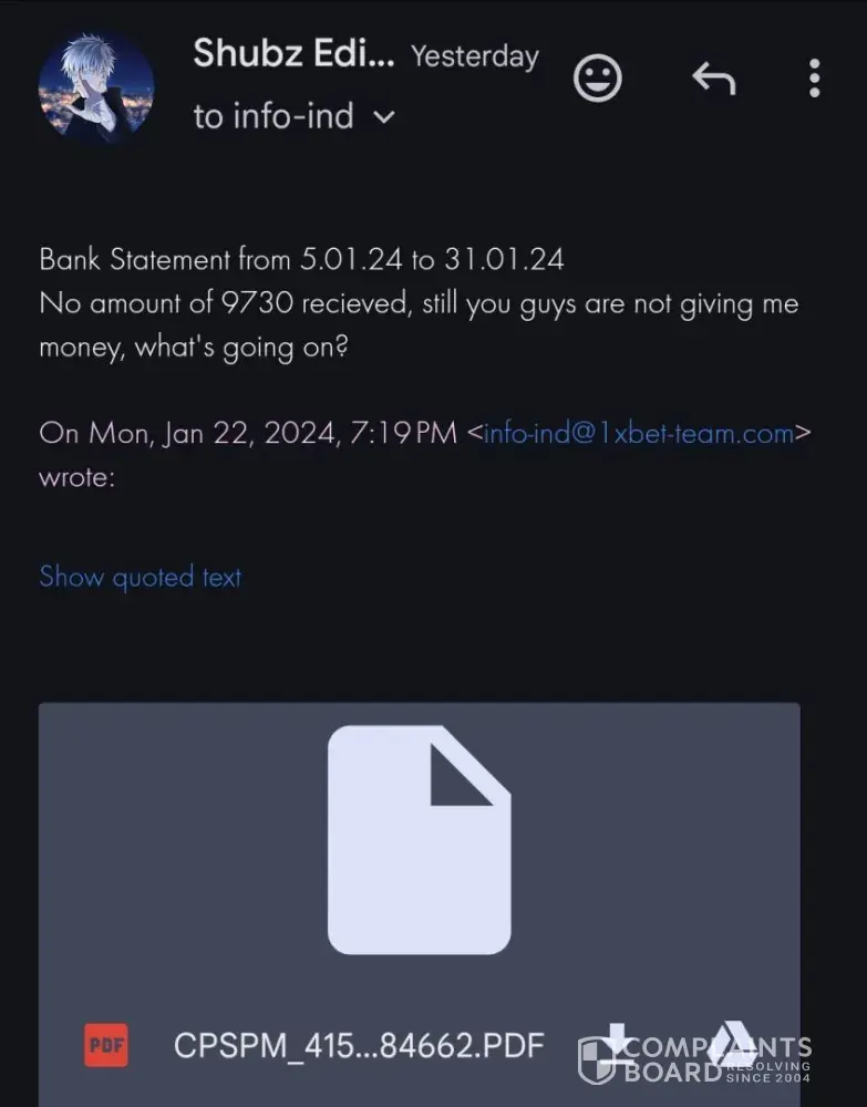 I already contacted 1xbet hundreds of time on e-mails. For my withdrawal of 9730 INR which was successful on 6 January & still not received. First they asked me for bank statements, when i provided them they asked for confirmation from bank, when i again provided them, they are now copy pasting the same thing. It is paid & raise issue in my bank again. Thi...