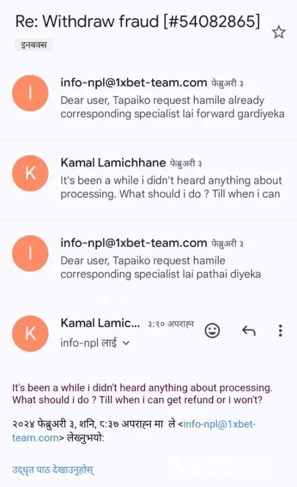 I am even scammed on this platform. Scammers contacted me through the complaints board inbox in the name of 1xBet Officials and posted some local numbers. They referred me to a Bangladeshi Number and I was scammed. The earlier update was about scammers. No matter how I deal with the scammers, 1xBet should deal with my matters.