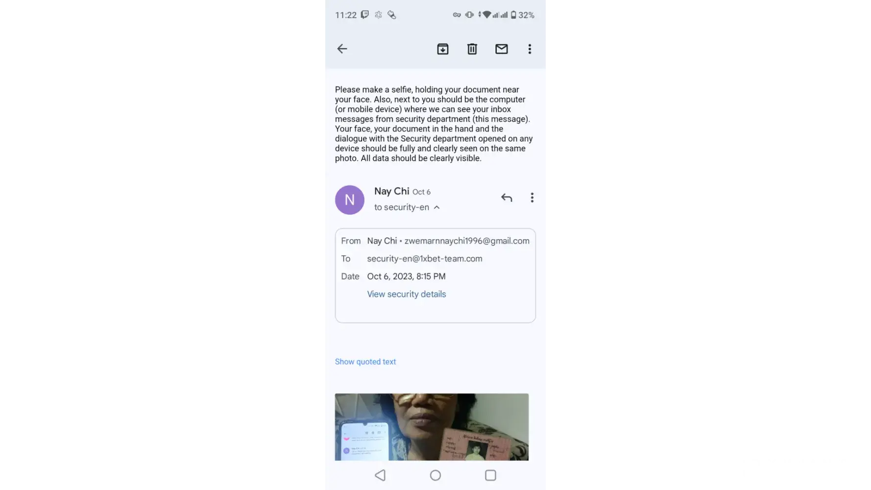 I use 1xbet more than 2 years. I found its service is nice so I created my account. Made a deposit of 90000 tk and win some money. I try to withdraw from my account but I can't withdraw as security Department asked for my documents. Its all right, so i gave them my National identity card. And then security Department asked a selfie with my NID card and their email. I did it also. After some time they asked some questions about my account. I accurately answer them.
