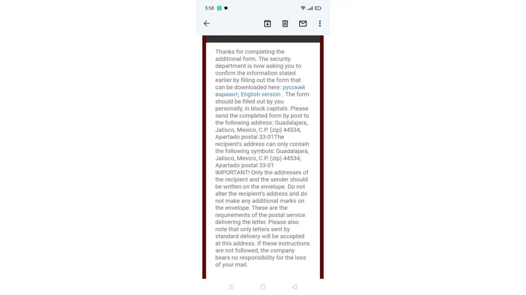Account blocked after impossible mailing demand