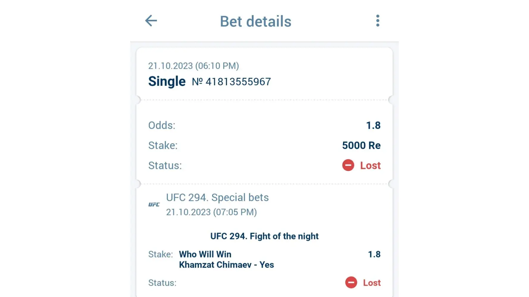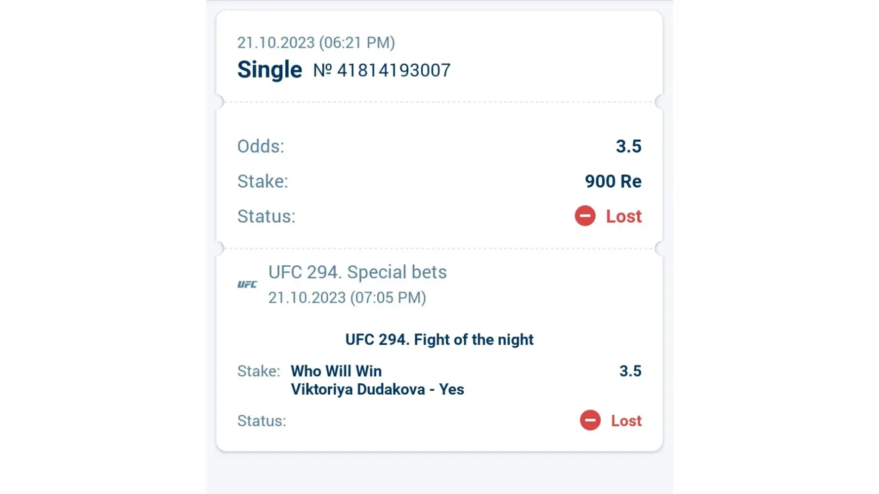 I placed two bets on UFC 294 matches, first match between Khamzat and Usman (Date:21-10-23, Time:06:10pm local, Bet Slip No:[protected]) and the second match between Viktoriya and Jinh Yu Frey (Date:21-10-23, Time:06:21pm local, Bet Slip No:[protected]). I won both the bets but the status shows otherwise and has not refund my winnings! I request you to please review the matter and resolve it as soon as possible!