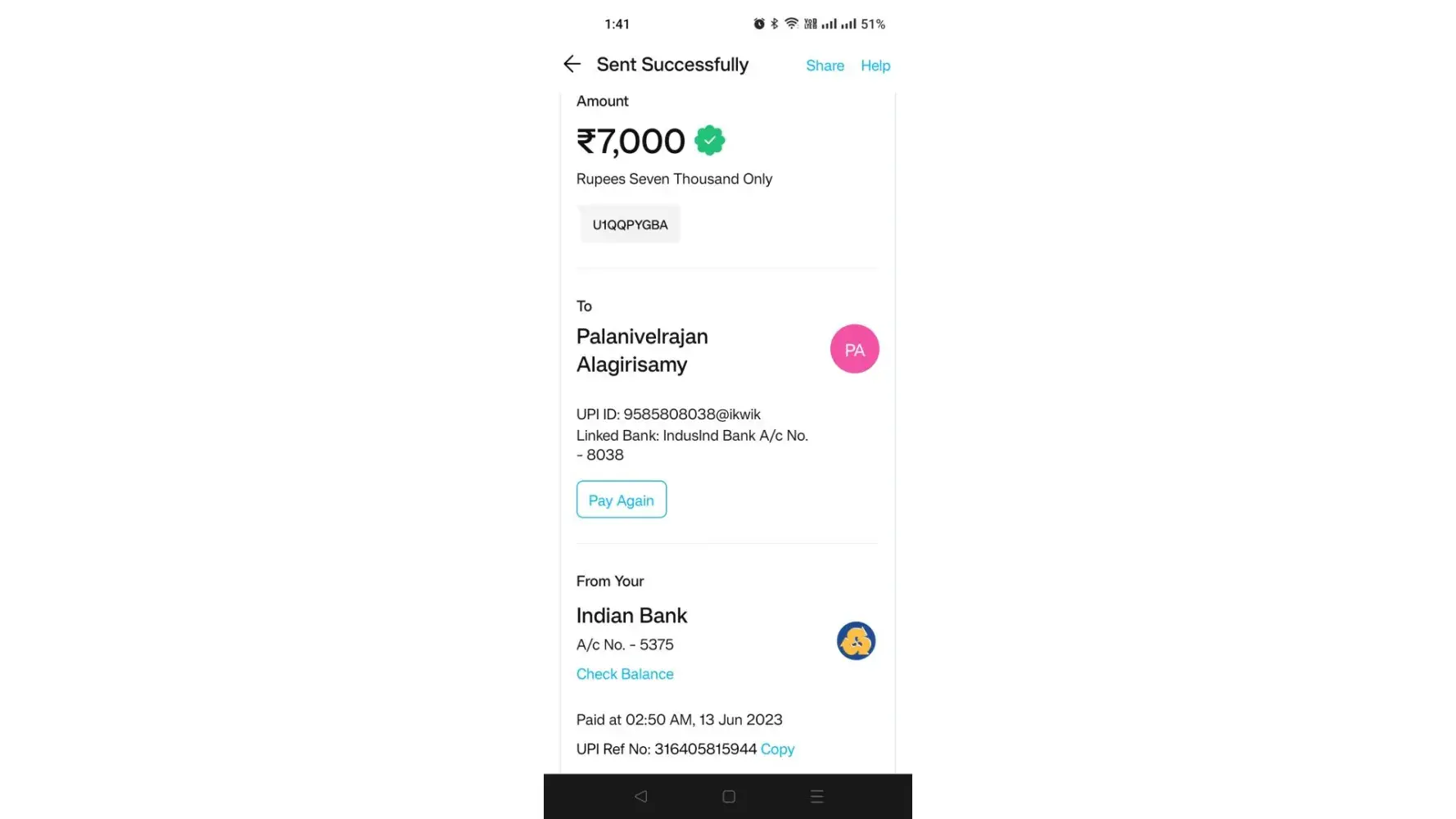 Both payments are successfully sent to receiver of "PALANIVELRAJAN ALAGIRISWAMY"