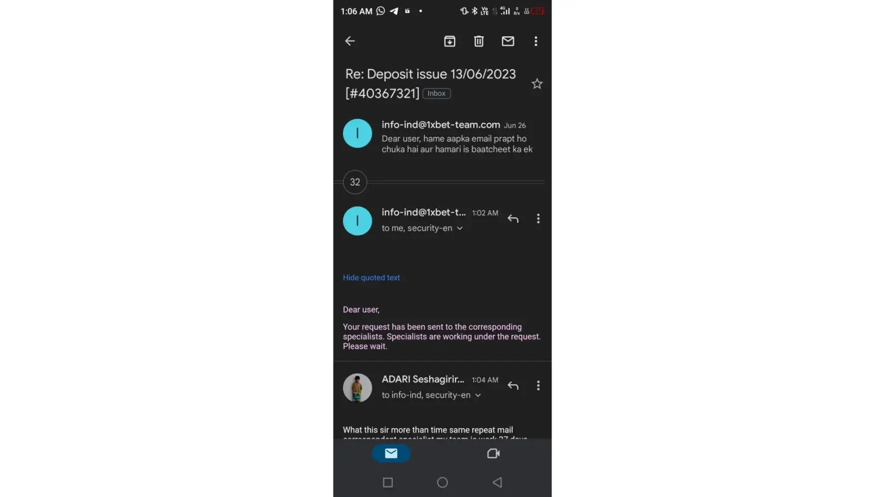 Worst 1xbet team my deposit amount 37 days complete this reply (dear user, your request has been sent to the corresponding specialists. Specialists are working under the request. Please wait.) my side bank statement upi transaction screenshot send but no result day by day my team is work department specialist correspondent working 37 your team work