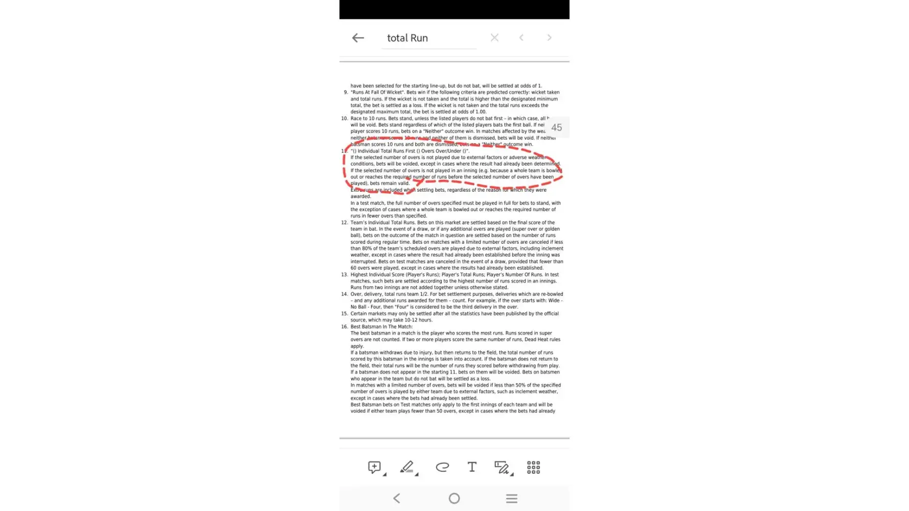 In this case many of betting companies like bet365, Melbet, Dafabet etc settle it as a void bet. Even according to 1xbet rules (“() Individual Total Runs First () Overs Over/Under ()”. If the selected number of overs is not played due to external factors or adverse weather conditions, bets will be voided, except in cases where the result had already been determined.) of cricket match it should be void but unfortunately I have lost money in this situation. That's all.