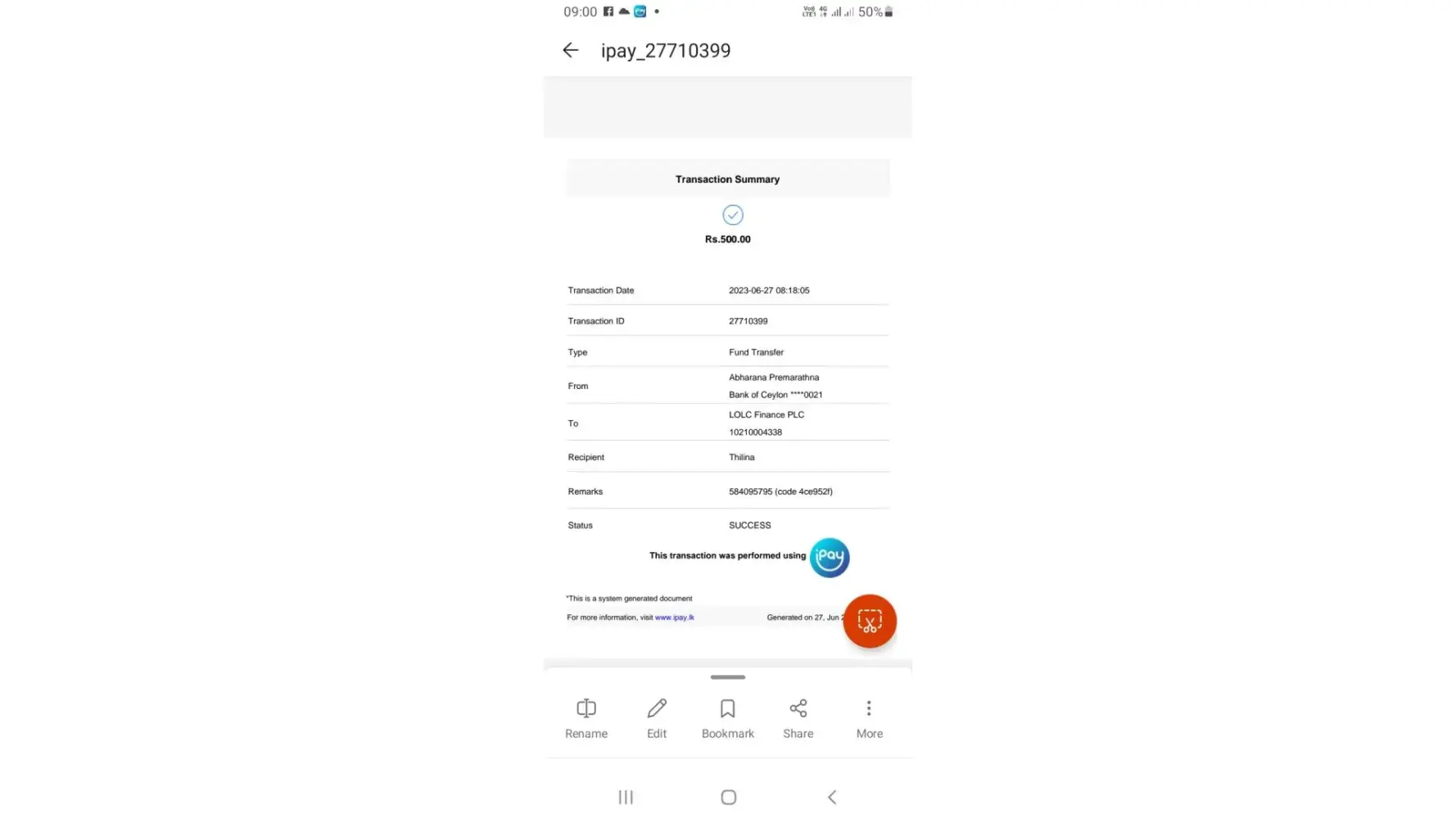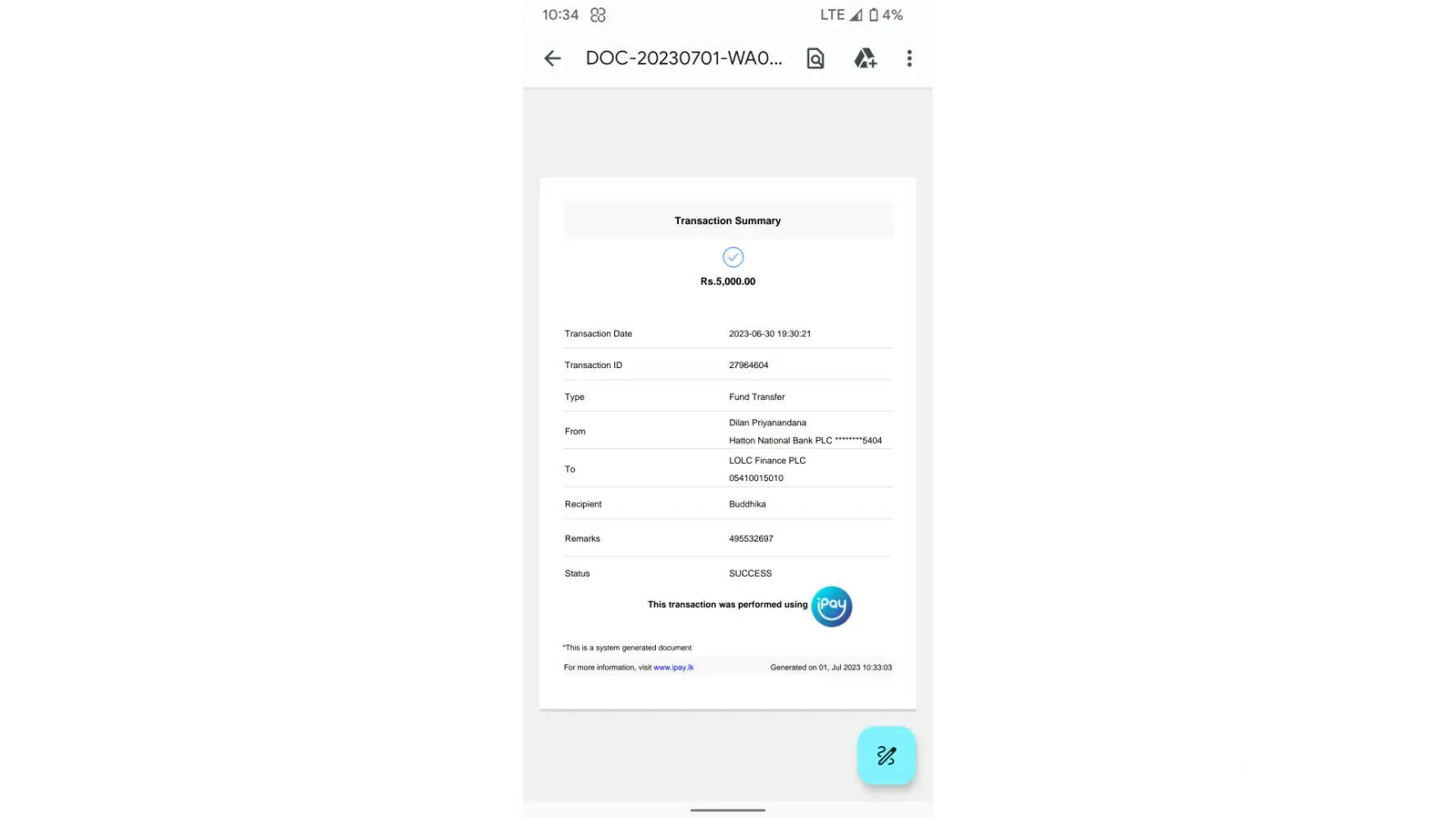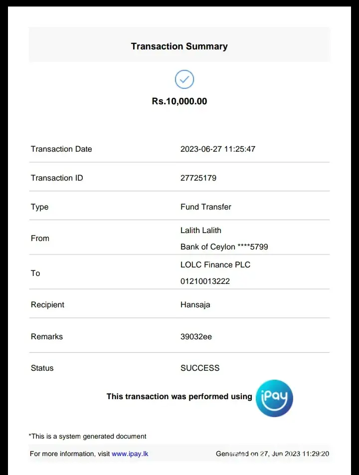 2.Transaction id: AES3RY76LX