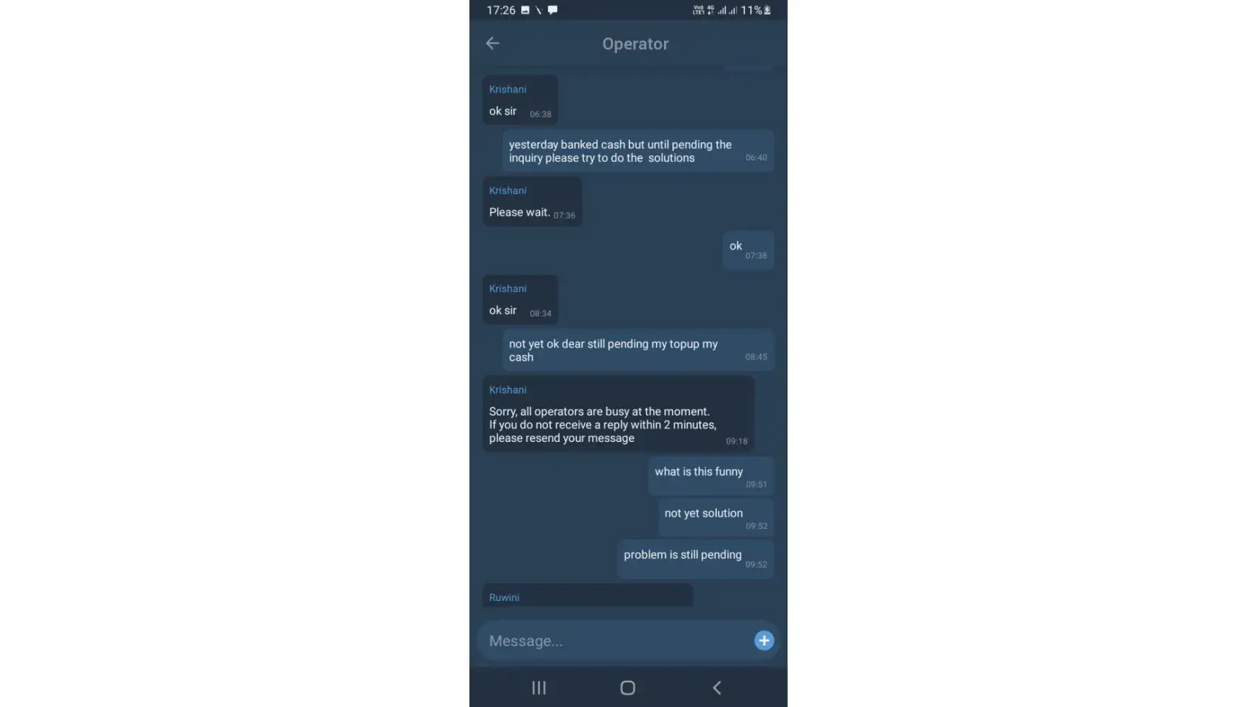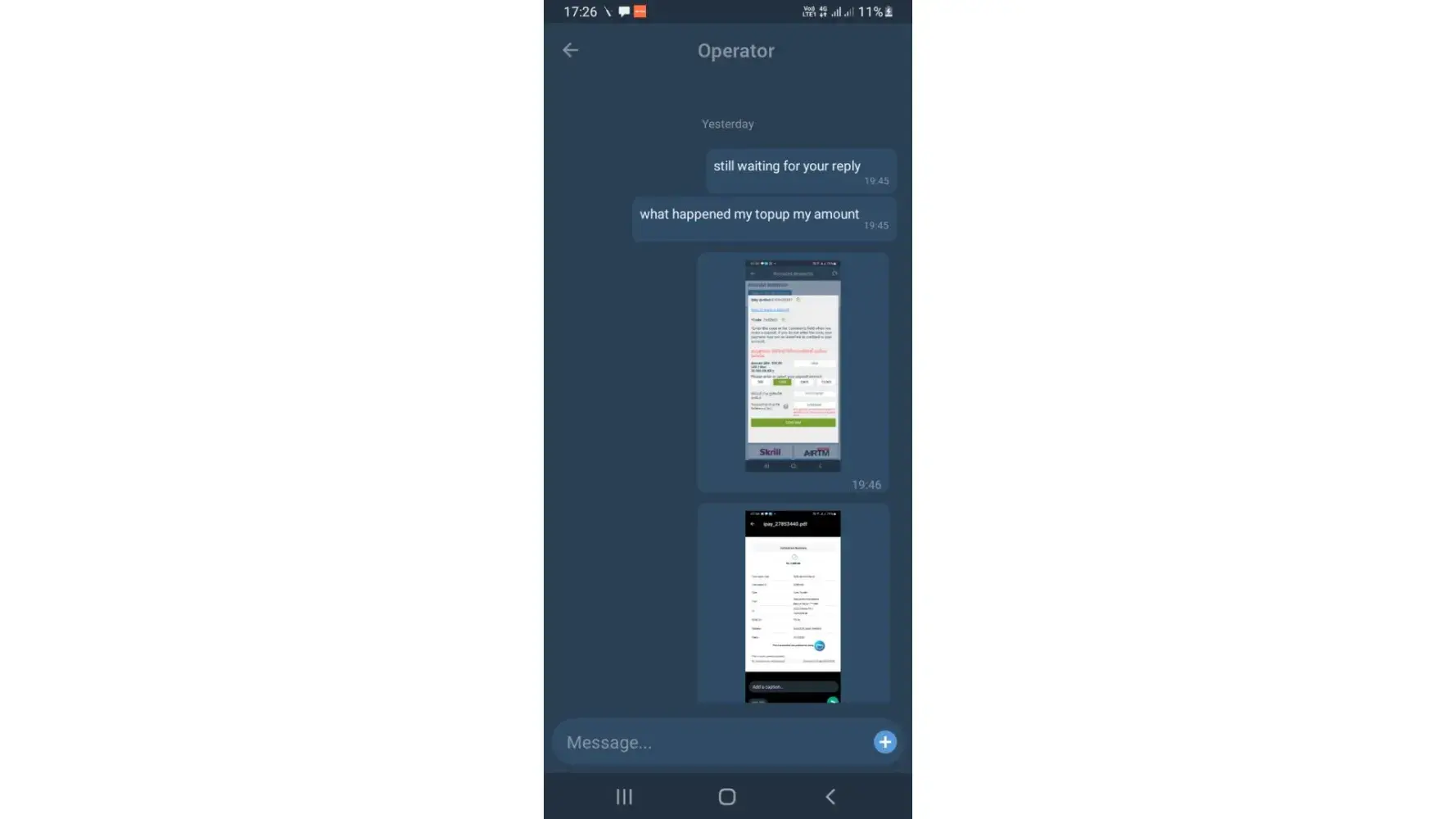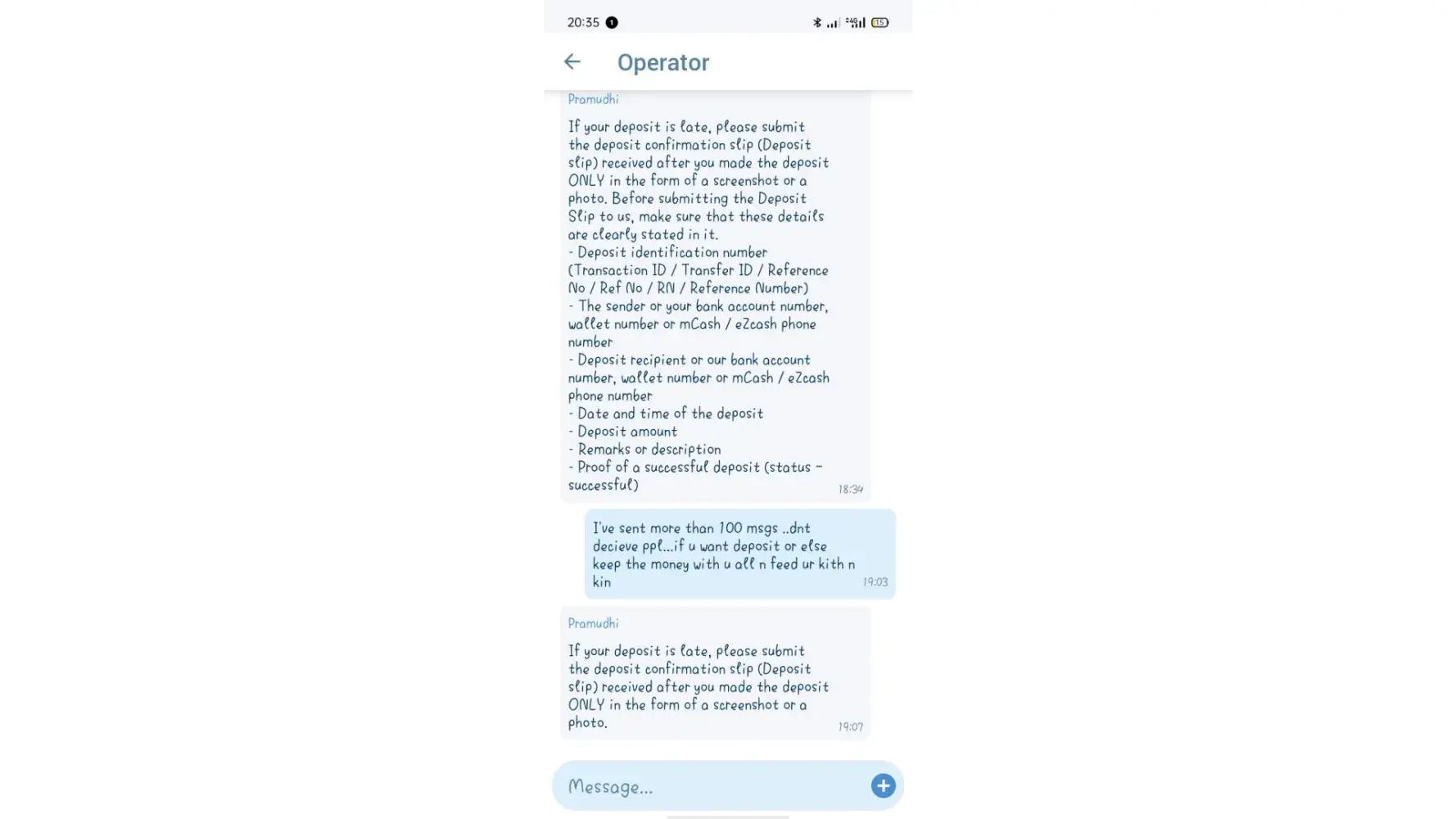 As per your above mail, I talk with your Bangladeshi security in-charge officer named (Harun Roshid, +[protected]/What'sApp) and he said that is our agent no [protected] and you send BDT 3000.00 then I send BDT 3000.00 through bkash e-wallet.(attahed receipt). But till now BDT 3000 can not add my gaming ac-[protected] . Now I am very unhappy for this resion. So you