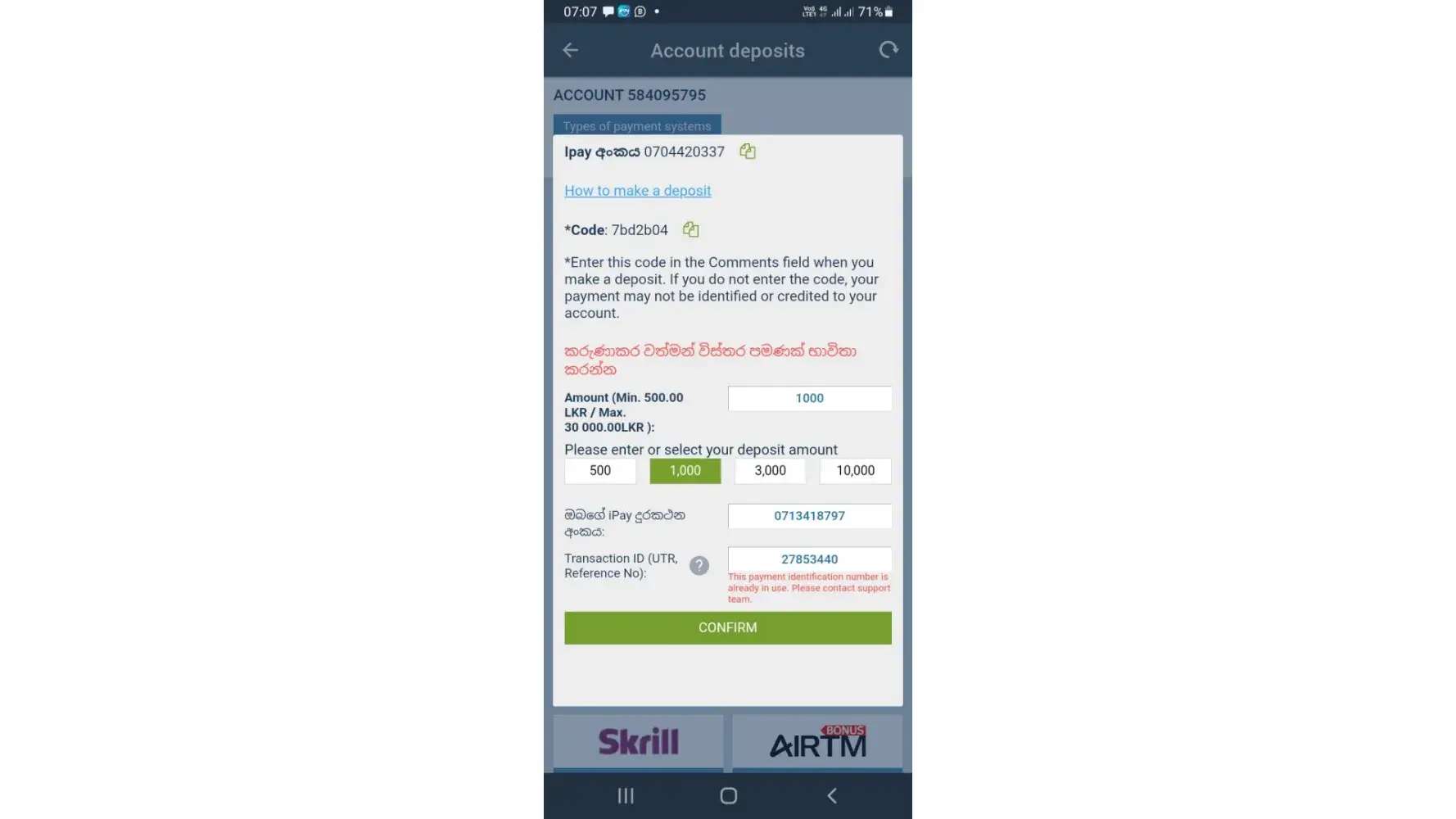 But when I'm trying to confirm the recharge confirmation from 1Xbet app, i was unable to do it because of the reason of "Payment identification number in use" as shown in screenshot, and my deposited money not yet received to my 1Xbet account.