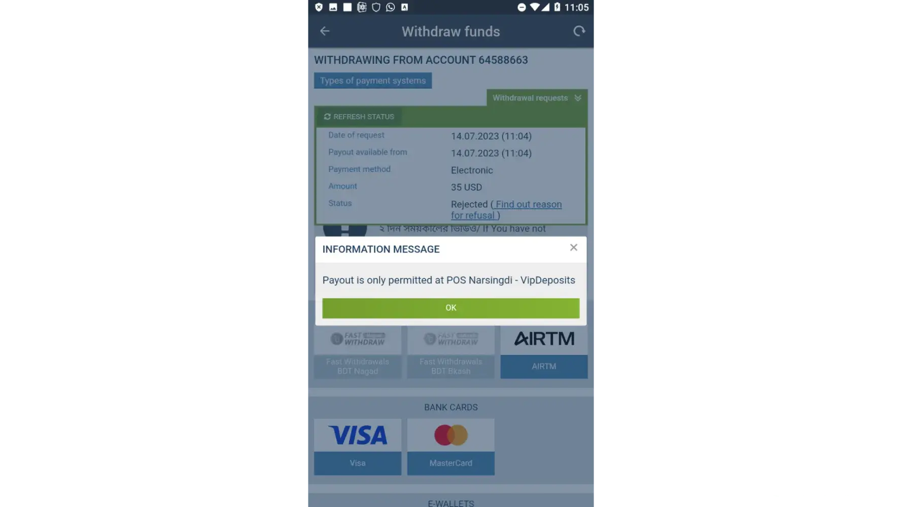 My Account ID is [protected].For last 6 months I cant withdraw my USD funds to my desired account automatically.Whenever I made a withdraw request on the method I deposit it is rejected saying "Payout is only Permitted at POS Narsingdi-VipDeposits".Few times I deposited my account using this agent.If I made deposit using Airtm or skrill it is stll says this.I talked to support they are saying you can make withdraw only via them.One time I got manual withdraw but how many times I need to contact with your support team to get manual withdraw?Why not I have the freedom to withdraw on what my deposit method was?Moreover when I use other methods to deposit I paid extra to make deposit but while withdraw I dont get the same because your agent gave very small value which make me huge loss(around 20%).It wouldnt make huge loss if I could get withdraw the method I used for deposit.