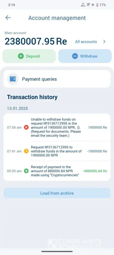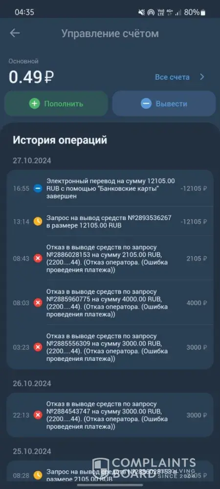 My account is [protected]. On October 27, I withdrew money from the bookmaker's office for a total amount of 12105 rubles. The bookmaker approved the withdrawal of funds, but the money was not transferred to a bank card. I can confirm this with a bank statement, a screenshot. The support service is not responding. My money was stolen.
