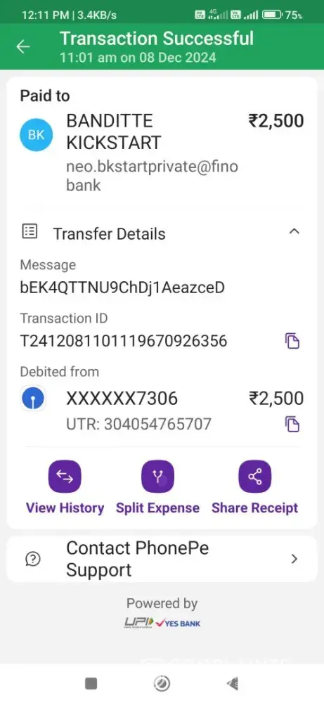 Sir maine ₹2500 diposit Kiya date 8/12/24 ko BANDITTE KICKSTART neo.[protected]@fino Bank ko maine phone pay ke dwara ₹2500 diposit Kiya lekin amount abhi tak mere gaming I'd me credit nahi hua hai please check kare aaj toh 24 hours se jyada ho gya hai pahle meri chat ke dwara diposit and withdrawal ka salution ho jata tha lekin ab toh saare care bale busy aa rahe hai . please check kare my amount