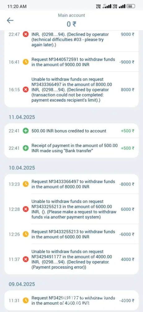 I have made request for 4k on 9th April they rejected 6k on 10 april they rejected 8k on 10 april they rejected 9k on 11 april they rejected 10k on 12 april is in processing and today they will also rejected. Reason giving limited exceeded or denied by operator. I don't know why they are doing this. Actually they harassing me. Kindly resolve my issue and make succes my withdrawal so I can make some payment. Thank you.