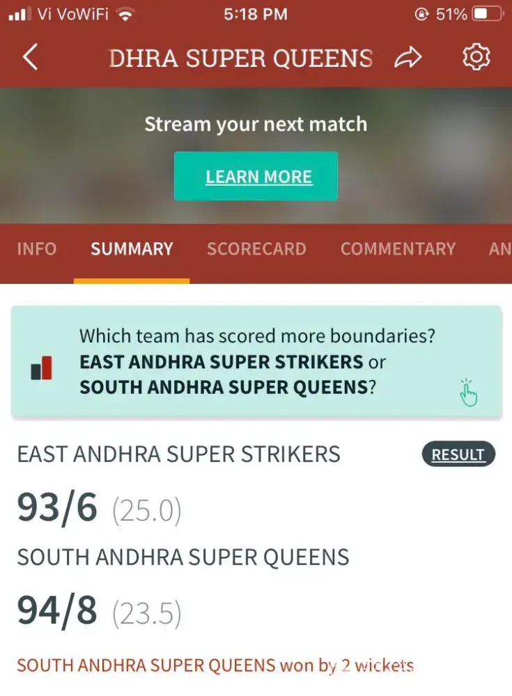.You are sending me link of match between East Andhra super striker and south Andhra super queen this is not my bet match .