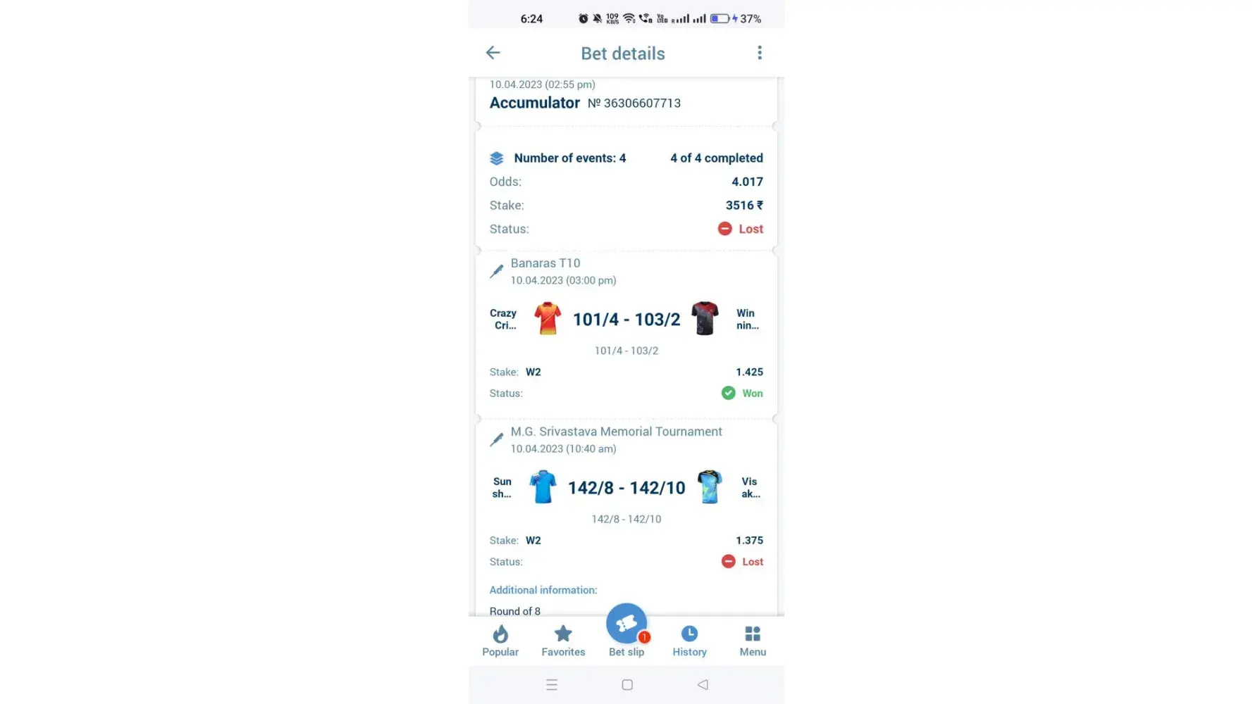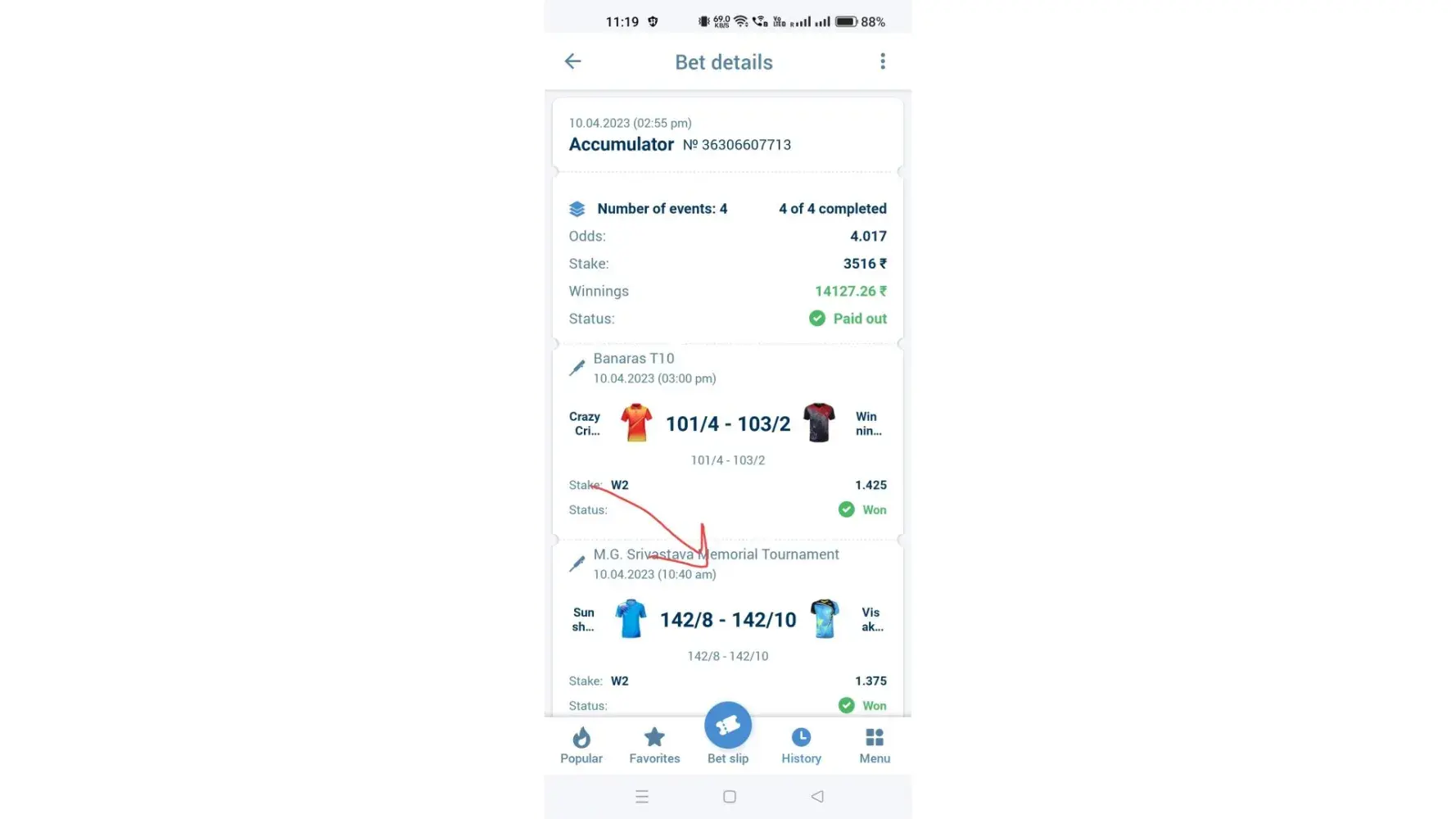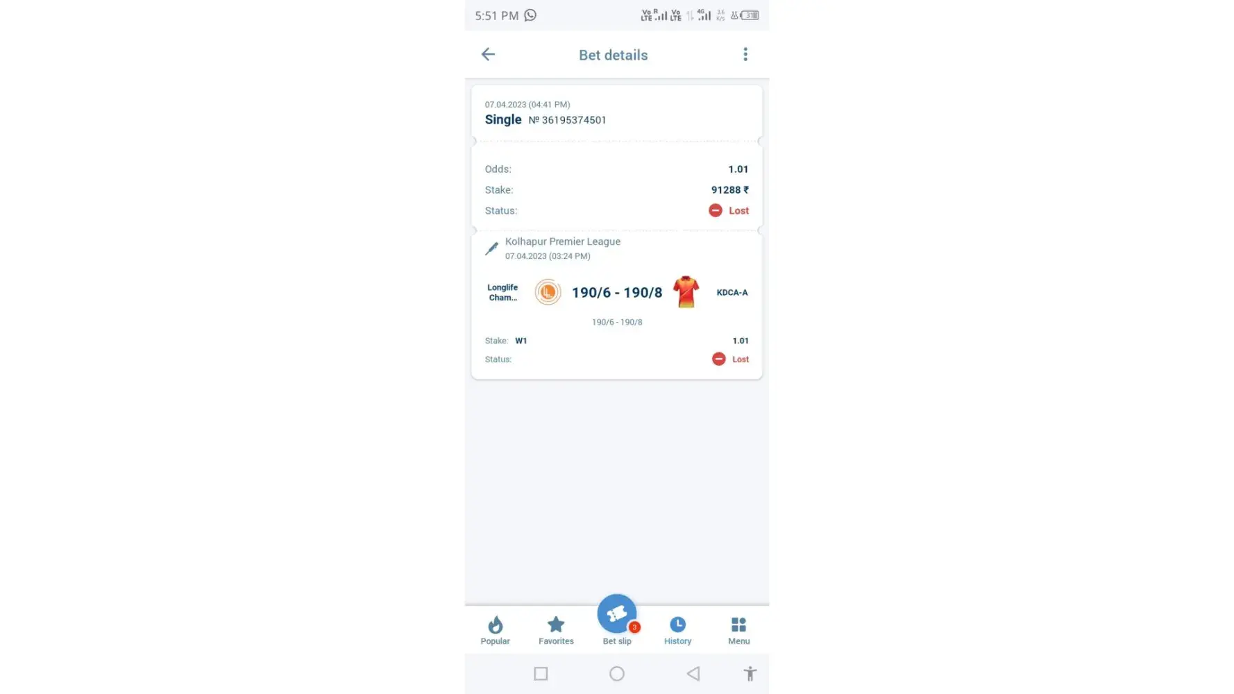 1st fall you send wrong link match .I'm talking about longlife champion and Kdca-a team match please check scorecard also .You are sending me link of match between East Andhra super striker and south Andhra super queen this is not my bet match .My bet slip number is [protected] match between longlife champion and Kdca-a team.please check carefully Target is 190/6 which made by longlife team and Kdca-a team made 106/9 which is clear win by longlife champion team.please check my link now https://cricheroes.in/scorecard/6361405/Kolhapur-Premier-League-(-KPL-2023-)/LONGLIFE-CHAMPION-KOLHAPUR-vs-KDCA-A