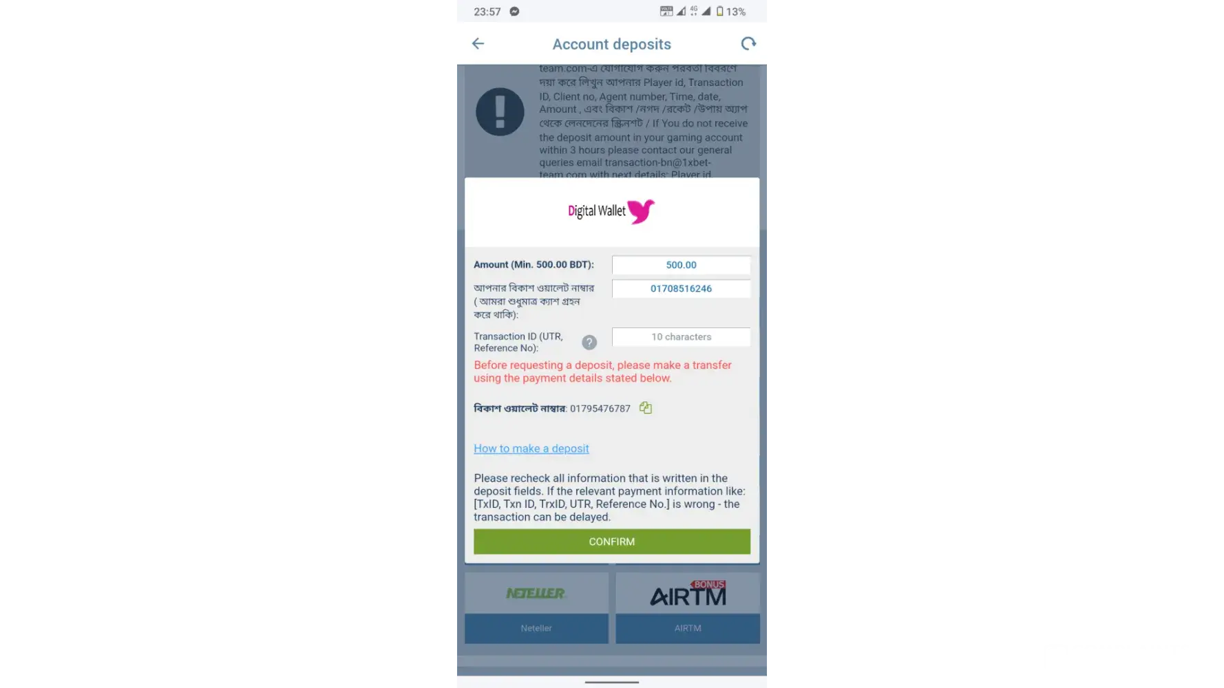 First 31 January i deposit 1000bdt but i put 500 and agent gives 500 and rest of fund he eat.