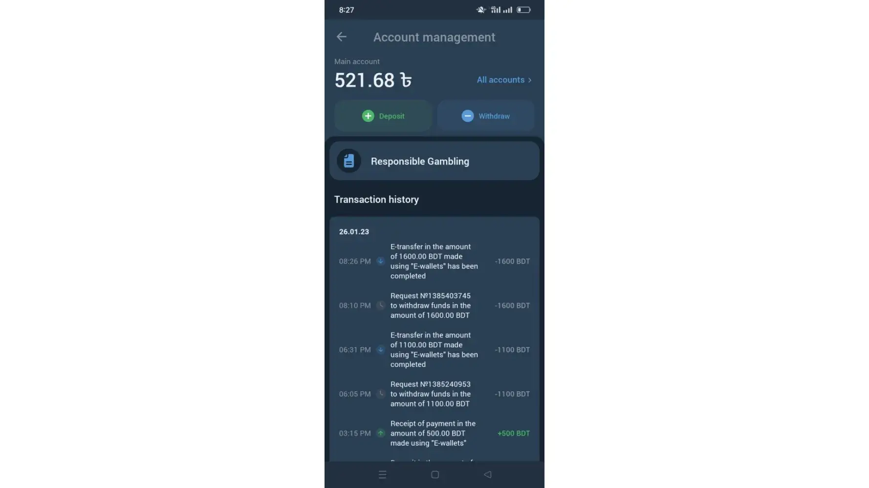 মার à¦à¦‡ উইডà§à¦°à§‹à¦•ৃত টাকাটি সঠিক à¦à¦¾à¦¬à§‡ পাইনি। যেমন আমি ১৬০০ টাকা উইডà§à¦°à§‹ দিয়েছিলাম যা আপনারা à¦à¦•à§à¦¸à§‡à¦ªà§à¦Ÿ à¦à¦¬à¦‚ কনফারà§à¦® করেছেন। কিনà§à¦¤à§ আমার কাছে টাকা à¦à¦¸à§‡à¦›à§‡ মতà§à¦° ৬০০ টাকা। বাকি ১০০০ টাকা কম আসার কারন যানিয়ে আমি à¦à¦•টি ইমেইলও করেছিলাম। কিনà§à¦¤à§ ১২ ঘনà§à¦Ÿà¦¾ অতিকà§à¦°à¦® হয়ে গিয়েছে। অথচ à¦à¦–নো পরà§à¦¯à¦¨à§à¦¤ কোনো রিপà§à¦²à¦¾à¦‡ পাইনি। দয়া করে আমার পাওনা অরà§à¦¥ আমাকে বà§à¦à¦¿à§Ÿà§‡ দিন। হেলো সà§à¦¯à¦¾à¦° আপনারা à¦à¦–নো পরà§à¦¯à¦¨à§à¦¤ আমার à¦à¦‡ সমসà§à¦¯à¦¾à¦Ÿà¦¾à¦° কোন সমাধান করেনি।