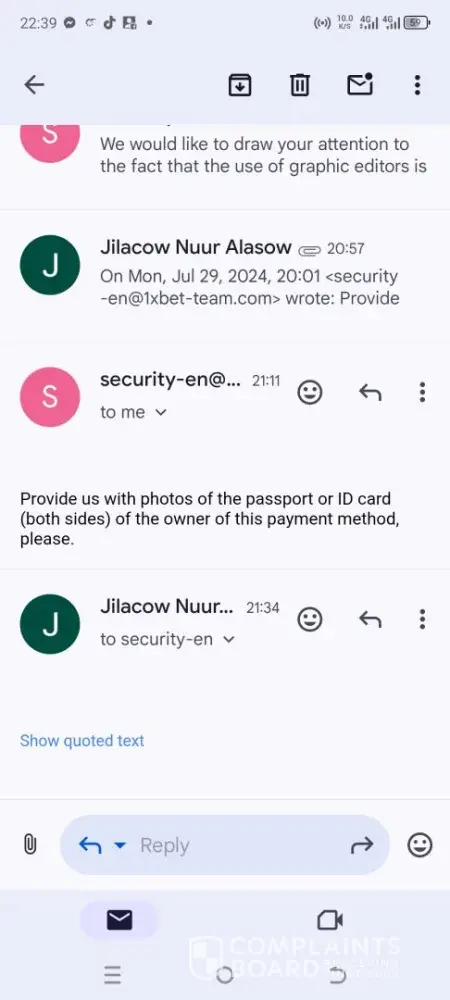By the way, I have already contacted complaints@1xpartner.com and they have not helped me atall. Overall, I tried everything and everyone within 1xbet for help and even after 33 days now, no one is helping. All your team says is "we are working on it" . Extremely terrible experience. Absolutely pathetic. Scrabbling and wasting my time.