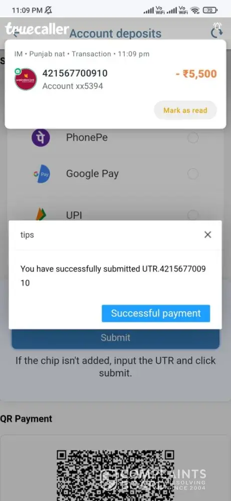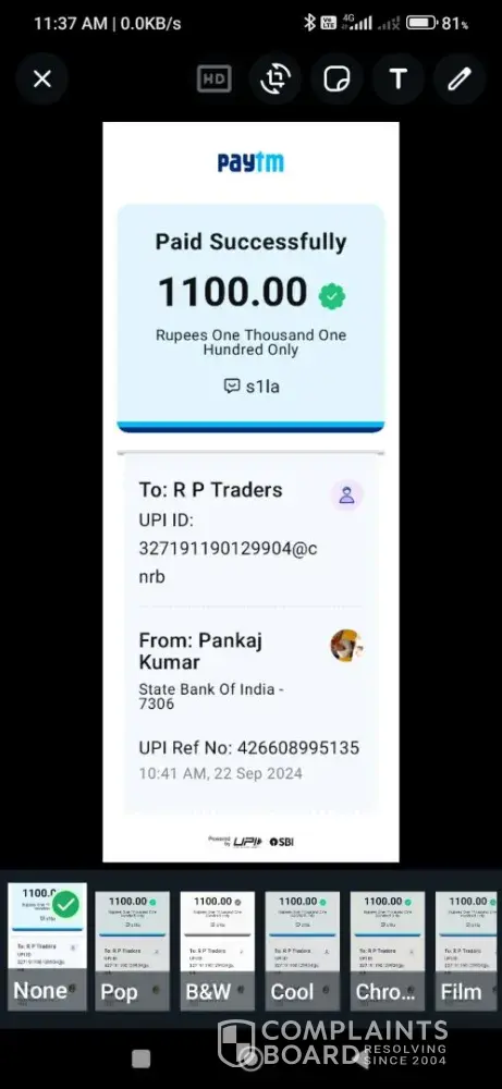 Sir maine RP traders UPI ID [protected]@cnrb time 10.41 am.date 22 sep.24 UTR nom.[protected] hai maine paytm ke dwara diposit ₹1100 diposit Kiya tha lekin amount abi Tak account mein credit nahi hua hai please check kare my refund in my gaming I'd [protected] me credit kerne ka kasht kare pleas sir Aaj kite din ho gaye hai lekin amount abi Tak meri gaming mei credit nahi hua hai please check kare