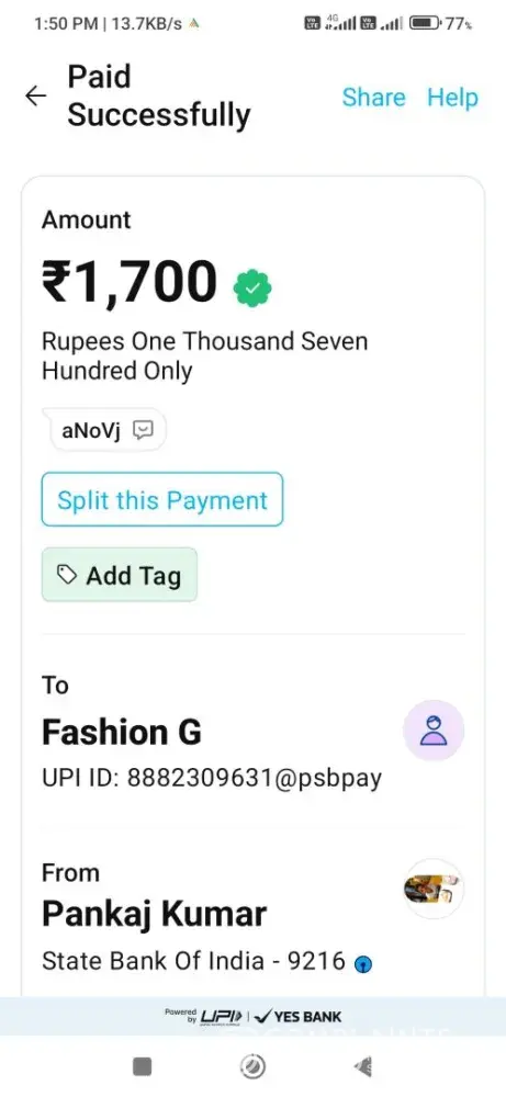 Sir maine fashion G UPI ID [protected]@psbpay ke account mein Paytm ke dwara ₹1700 diposit Kiya tha date 12/8/24 time 1.19 pm per lekin amount abi Tak account mein credit nahi hua hai sir mere account se paise bi kat gai aur gaming I'd me credit nahi hua amount sir baar baar yahi ho raha please check kare maine paytm ke dwara payment diposit Kiya UTR nom.[protected]