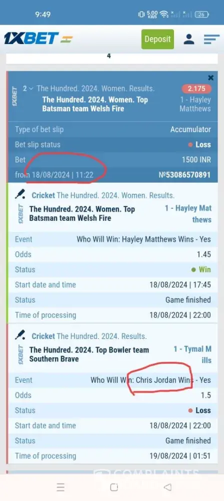Claimed loss: My 1X Betslip ID : [protected]. But I didn't placed on Chris Jordan as Top Wicket Taker at 1.5 Odd, I place on Tymal Mills -1.5 Odd, Please check the Past Odds on 18/08/2024 . So please Refund the Amount.